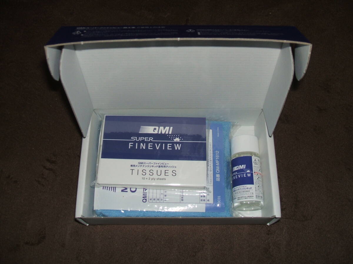 QMI スーパーファインビュー メンテナンスキット です。未使用品です。未使用メンテナンスリキッド、未使用の塗付用ティッシュ、未使用のマイクロファイバーのセットになります。長寿命ガラス撥水システムの簡易的に撥水補修を行うキットです。必要な方いかがでしょうか。箱にキズ、汚れ等があります。送料無料にて発送いたします。