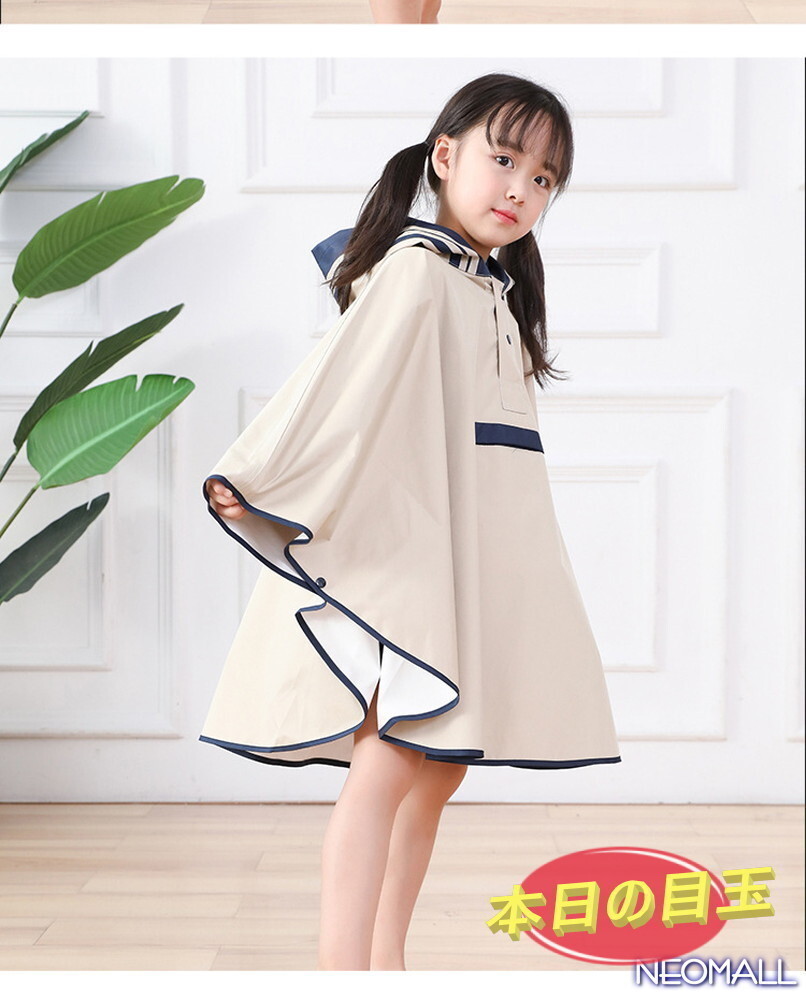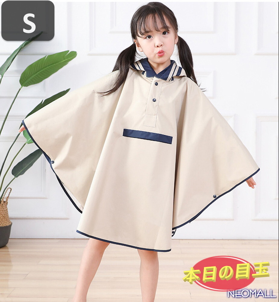 1円~【637】子供用 可愛い レインポンチョ ベージュ Sサイズ 身長 75cm - 90cm 防水 撥水 雨具 雨 雪 ゲリラ豪雨 通園 通学 お出かけ