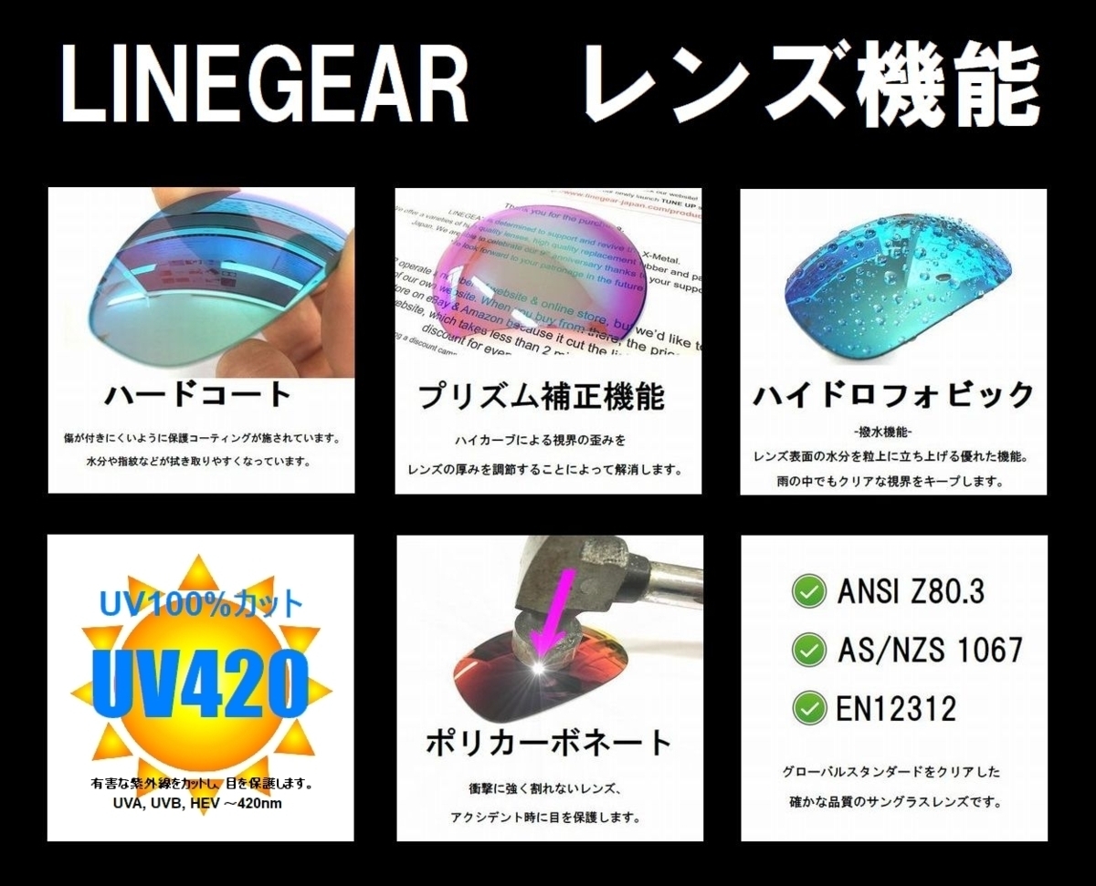 濃いめのレンズにブラウンレンズに明るいゴールドミラー。目が透けて見えることはありません。ベースレンズはブラウンなので、少し明るめに感じ、コントラストのある視野を提供してくれます。プリズム補正機能(Dセンター)レンズなので、視界のゆがみも矯正します。ミラーはプラチナミラーという特別なミラーが付いていて、高級感のある、レンズの印象は深い光沢のあるゴールドになります。<レンズの詳細>・ミラー:明るいゴールド・ベースレンズ:ブラウン・透過率:11.00%・レンズカーブ:8・レンズの厚さ:1.6mm - 1.4mm・夜間の運転不可 /昼間の運転可※レンズ交換は手で簡単に行えます。パチンと外して、パチンと取り付けるだけです。※画像に写っているフレームは付属しません。 レンズ(1ペア)のみの出品になります。