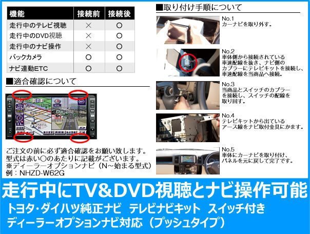 | ■視聴制限を常時解除 走行中のテレビ&DVDの視聴制限を常時解除することが出来ます。 ■ナビ操作制限も解除 付属のスイッチを使い走行中のナビ操作制限も一時的に解除することが出来ます。 ■連動機能への弊害無し バックカメラやETCも問題無く動作しますので、安心してご利用いただけます。 ■簡単取付&安心設計 純正配線に当商品を中継させてアース線を接続するだけの簡単設計です。 また、純正カプラーに中継させるカプラーオンタイプを採用しておりますので、純正配線を加工すること無く 取付が出来ます。 ■長期1年保証 1年の保証が付きますので、安心してお買い求め頂けます。 |