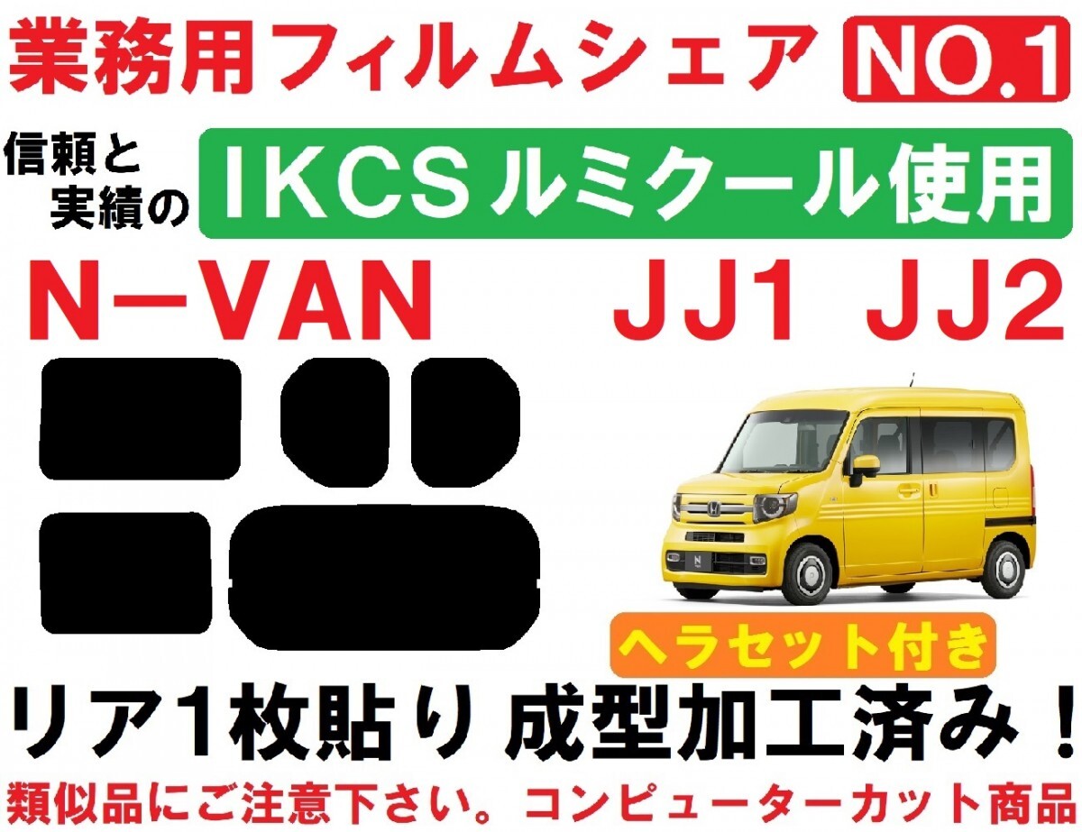 JJ1 JJ2 N-VAN用『IKCルミクール使用』カット成型加工済みフィルム、リア5面セットです。(専用施工液付き) ・信頼の品質と実績で永い間業務用フィルムとして選ばれ続けているIKC製品です。 ・業務用フィルムの中で最も信頼性の高い、ベストセラー商品です。 ・詳しくはアイケーシー株式会社HPをご覧ください。 ■適合に付いて■ 平成30年7月~ JJ1 JJ2 N-VAN に適合します。 グレードによりガラスの形状が異なりますので、ご落札後確認させて頂きます。 ※適合などご不明な点は、お気軽にご質問下さい。 ◇◆◇当商品には、画像2のヘラセットが付属します◇◆◇ ■滑りの良いシリコンタイプのゴムヘラ スムーズに水切り(清掃)・貼り付け後の水抜きが出来ます。 実際の業務でも色々な物を試しましたが、シンプルなこの形状・このメーカー・このグレードの物が1番使いやすいです。 柔軟性が有りガラス(フィルム)に密着するため、フィルム折れも防げます。 ■使いやすい厚みとコシの有るプラヘラ 形状は似ていても各メーカーにより硬さ・厚みなど色々と有ります。 慣れていない方でも扱い易いように少々柔らか目の物になります。 ヘラ先にはフッ素樹脂加工のクロスを貼って有りますので、滑りが良くキズを防止します。 ■ワイプオール(不織布ワイパー) 布同様の丈夫さと紙の持つ吸水性を発揮。糸くずの発生が無く均一素材のため異物混入の心配が有りません。 施工前のガラスクリーニング~施工時にフィルムが触れる可能性の有るガラスの周りのゴム部品の拭き取り清掃~吸水等に大変便利です。 全て実際の業務に使用している物で、その中から使いやすい物を選んでいます。 ヘラセットがご不用の場合、フィルムのみの商品も有ります。こちら ◇◆◇精密コンピューターカット◇◆◇ 貼りやすさを最優先に各部のサイズ・形状など微調整し、改良を重ねた独自のデータを製作。 高精度な最新・大型カッティングプロッターによるカットで正確で滑らかなカットラインを再現しています。 施工業者だからわかる、貼りやすいサイズ・形状に仕上げています。 ◇◆◇1枚貼り成型加工済み◇◆◇ リアガラスの湾曲に合わせて熱成型加工して有りますので、平面に貼るのと同様にたるみが出ず1枚貼り出来ます。 通常の成型加工に加え、独自の加工を施し しっかりと成型加工してありますので、追加工など一切不要です。 ◇◆◇専用施工液付属◇◆◇ 軽視されがちな施工液ですが、貼りやすさに大きく関わる部分になります。中性洗剤などで代用せず、必ず付属の専用施工液をご使用下さい。 濃度については車種・季節などにより変わりますので、個別にお知らせ致します。 国内シェアNO.1の『IKCルミクール』を使用しています。 IKCルミクールは経年退色が極めて少ない着色加工技術はもちろん、安定した冷暖房効率をアップする熱線遮断効果や断熱効果、内装を守り日焼けを防ぐため、全てのフィルムで99%の紫外線カットを実現しています。 ガラスの飛散防止効果で高い安全性を保ち、ハードコートタイプなのでキズにも強いカーフィルムです。 信頼の品質と性能で、永い間業務用フィルムとして選ばれ続けています。 ■フィルムの種類■ 可視光線透過率 3% NS-003HC 可視光線透過率 7% NS-008HC 可視光線透過率13% NS-015HC 可視光線透過率20% NS-020HC 可視光線透過率30% NS-030HC 可視光線透過率46% NS-045HC ■全商品、キズに強いハードコート・紫外線(UV)99%カットです。 ※可視光線透過率が低くなるほどフィルムの色は濃くなります。 サイドとリアで濃さを替えたり等、可能です。 部分的にフィルムが必要になった場合、単品販売も承ります。 他にもN-VAN用フィルム、各種出品中です。こちらもご覧ください。 ご不明な点など有りましたら、お気軽にご質問下さい。 | ||