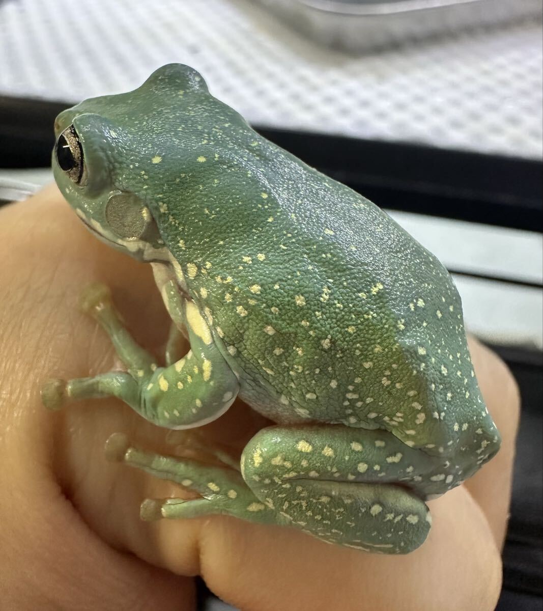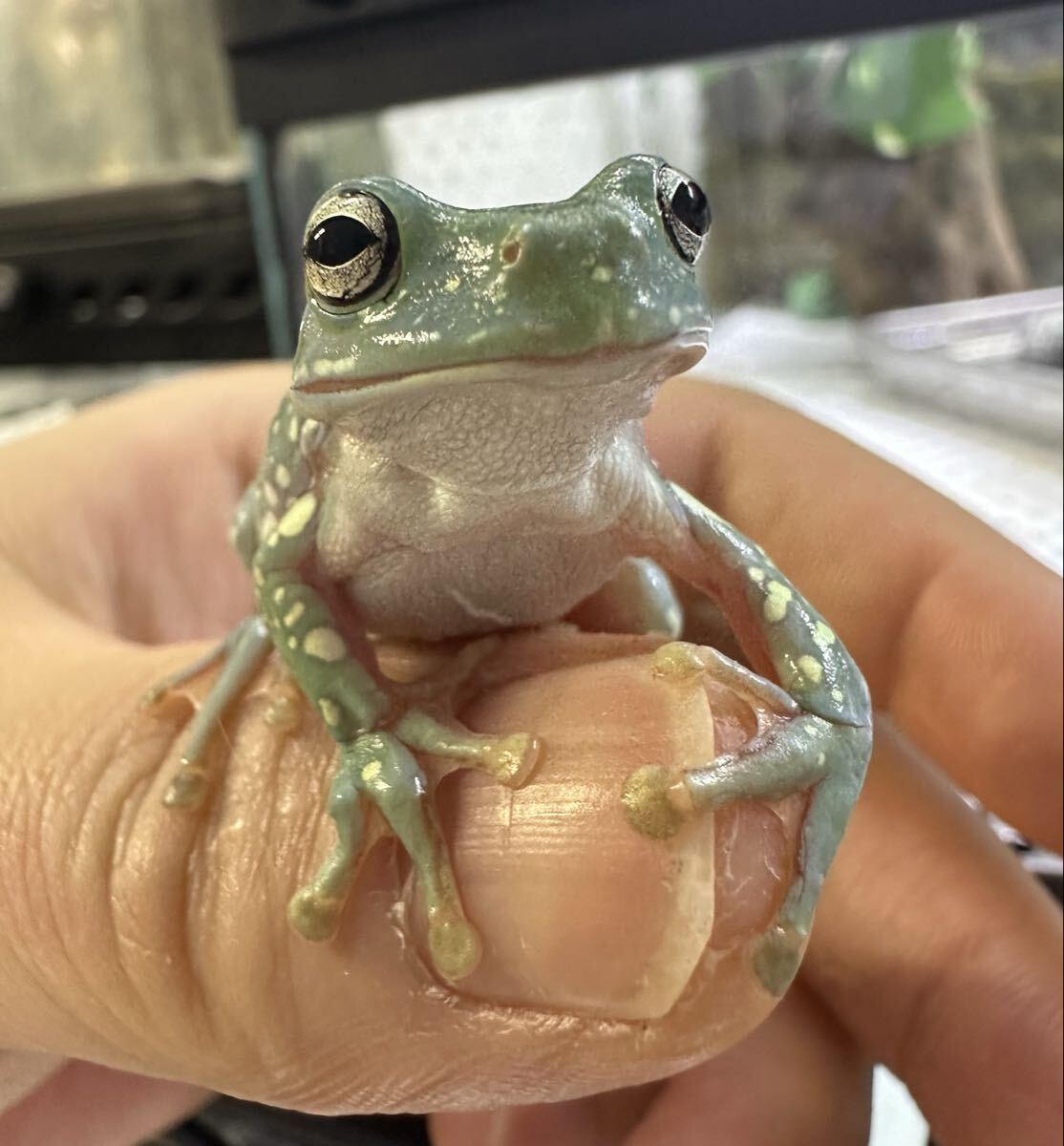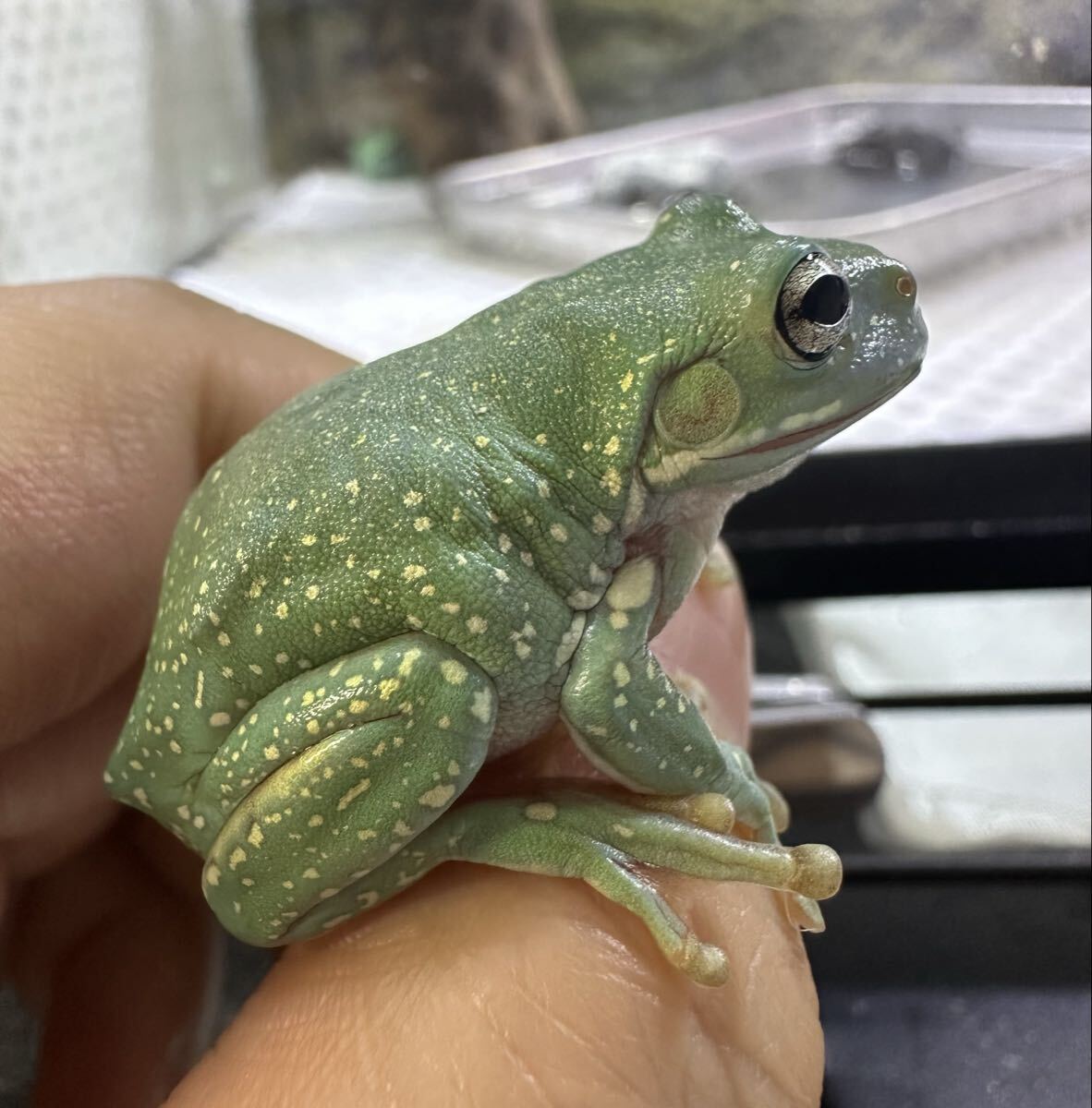 繁殖個体ブルーのイエアメガエルスノーフレークです。成長とともに青色が濃くなる個体です。サイズは3.5cmです。餌はイエコを与えております。保温して発送しますが生き物ですので死着保証は出来ません。よろしくお願い致します。