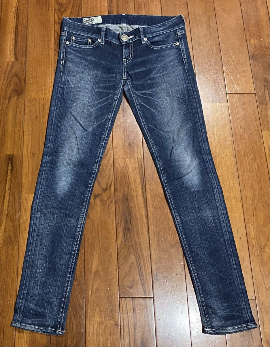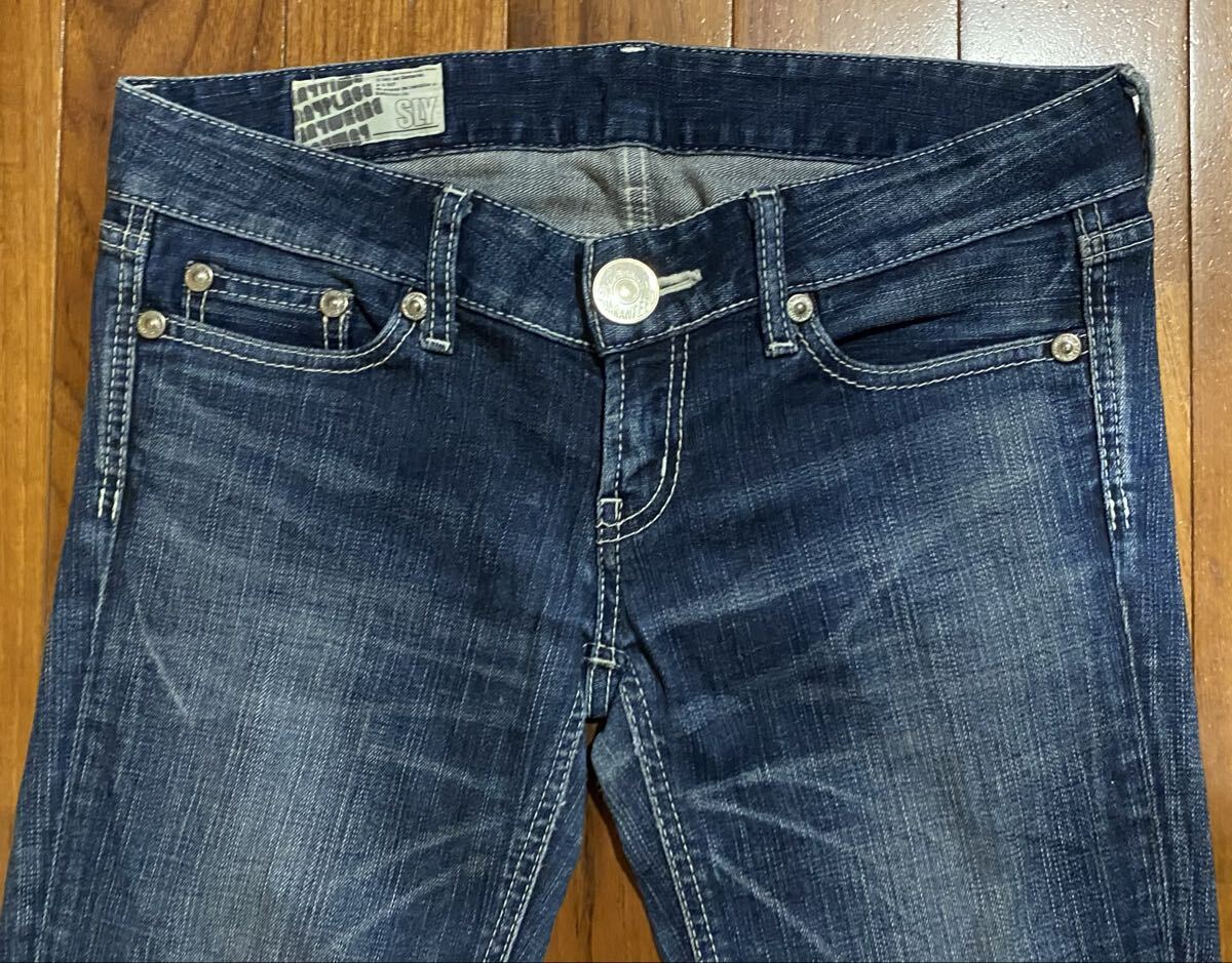 スライのストレッチスキニーデニム(ジーンズ)、N0.S2S72-0153-51です。色はインディゴブルーです。USEDでヒップ部分に少し擦れありますがその他の状態は良いです(10段階中7程度)。ジッパーフライ、裾はチェーンステッチです。生地はストレッチ入りでコットン99%、ポリウレタン1%です。正規品です((株)バロックジャパンリミテッド、日本製)。サイズはW27でウエストは重ねずに平置きで約81cm、ヒップ約91cm、股上約17cm、股下約78cm、股下15cmのふともも部分約44cm、裾まわり約28cm、重量約460gです。発送はゆうパケットポストになります。