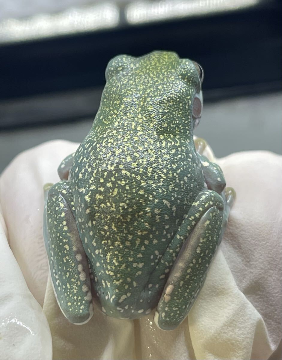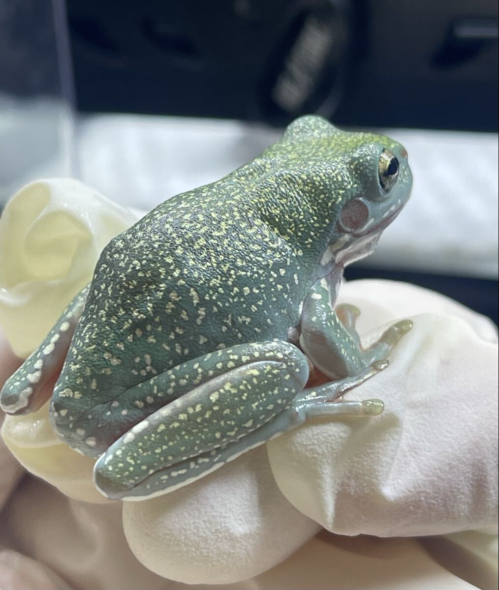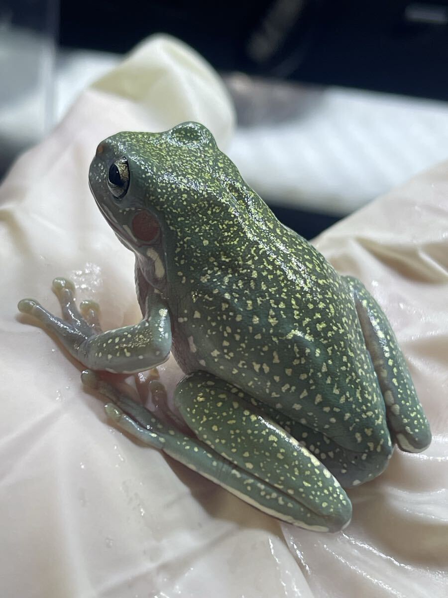 繁殖個体ブルーのイエアメガエルスノーフレークです。成長とともに青色が濃くなる個体です。サイズは4.5cmです。餌はイエコを与えております。保温して発送しますが生き物ですので死着保証は出来ません。よろしくお願い致します。