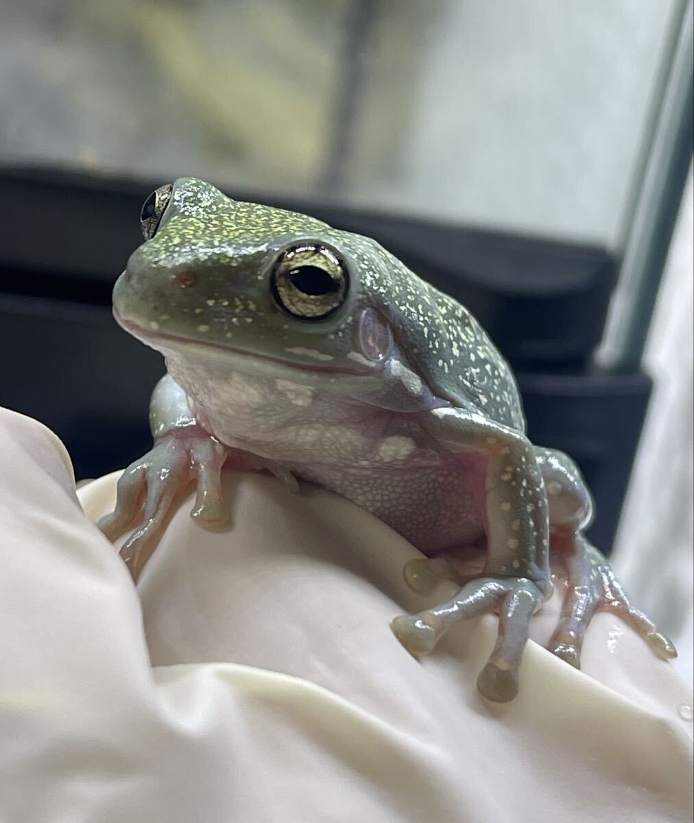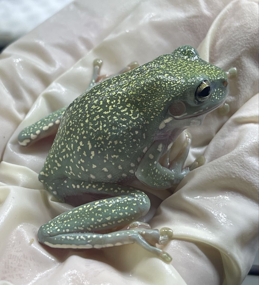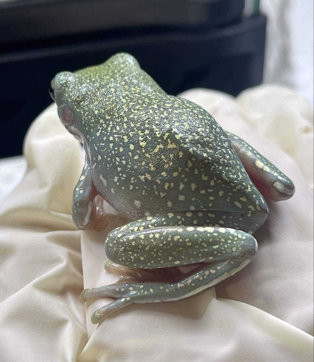 繁殖個体ブルーのイエアメガエルスノーフレークです。成長とともに青色が濃くなる個体です。サイズは4.5cmです。餌はイエコを与えております。保温して発送しますが生き物ですので死着保証は出来ません。よろしくお願い致します。