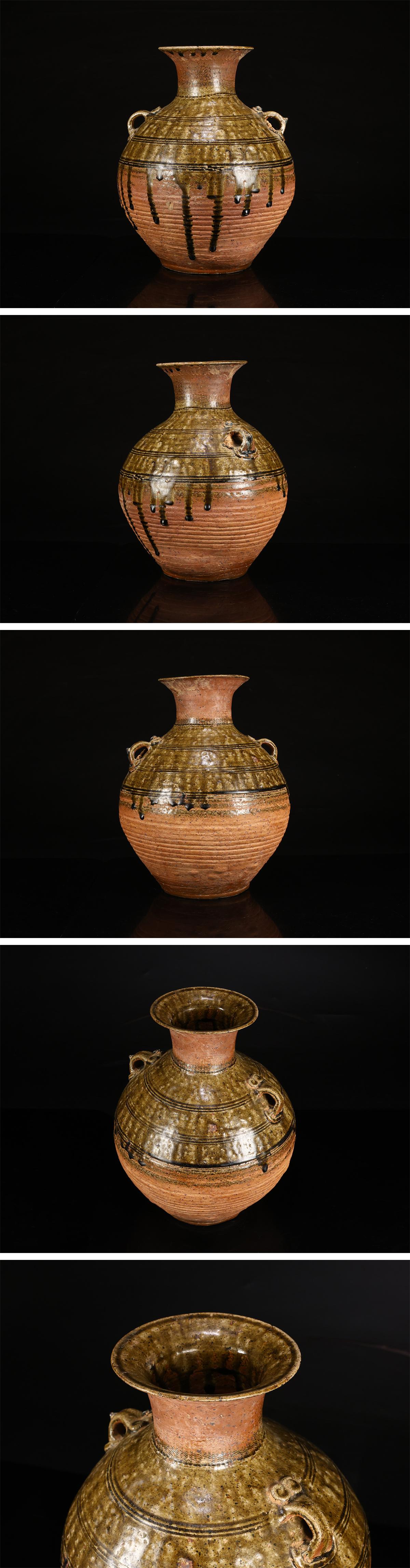 【吉】CO205 唐物 【漢代】 灰釉 双耳壷 大花瓶 高33㎝/本物保証 美品!