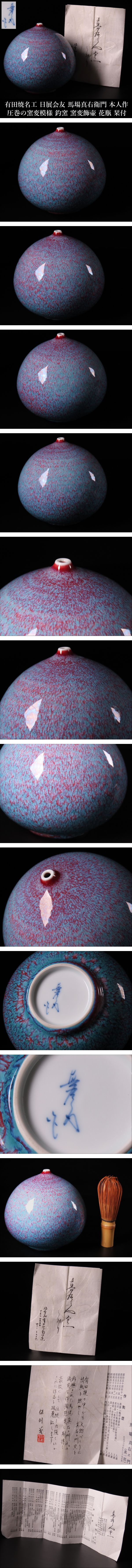 【ONE'S】有田焼名工 日展会友 馬場真右衛門 本人作 圧巻の窯変模様 釣窯 窯変飾壷 花瓶 栞付 古美術品 | |||