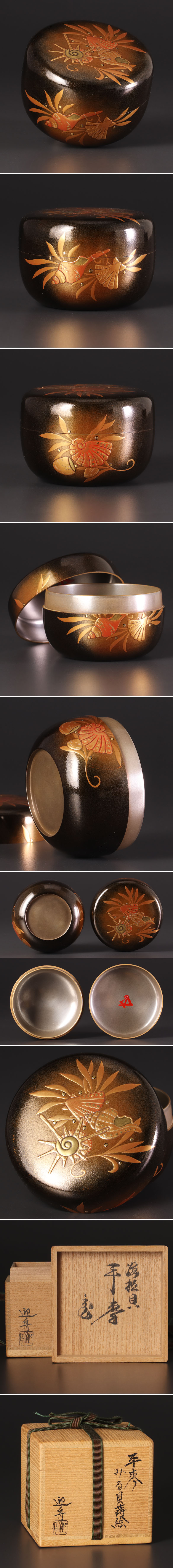 漆黒の底から湧き上がるような、奥深い黄金の階調が目を引く平棗です。蓋から側面にかけて、精緻な蒔絵で描かれた海松貝が柔らかな光を纏い、器全体に豊かな情景を創り出しています。 内側に広がる静かな銀色の輝きと、手に馴染む洗練された造形が調和し、茶席に格調高い静謐さと華やぎを添える、品格に満ちた一品です。 蓋裏に記された鮮やかな朱の花押が、作品全体を引き締め、確かな格調を添えています。漆黒と黄金が織りなす奥深い情景に、一点の紅が宿ることで、静謐な佇まいの中に凛とした気品が際立ちます。 ★商品は山崎迎舟作、鵬雲斎書付の作品である事を保証致します。 |