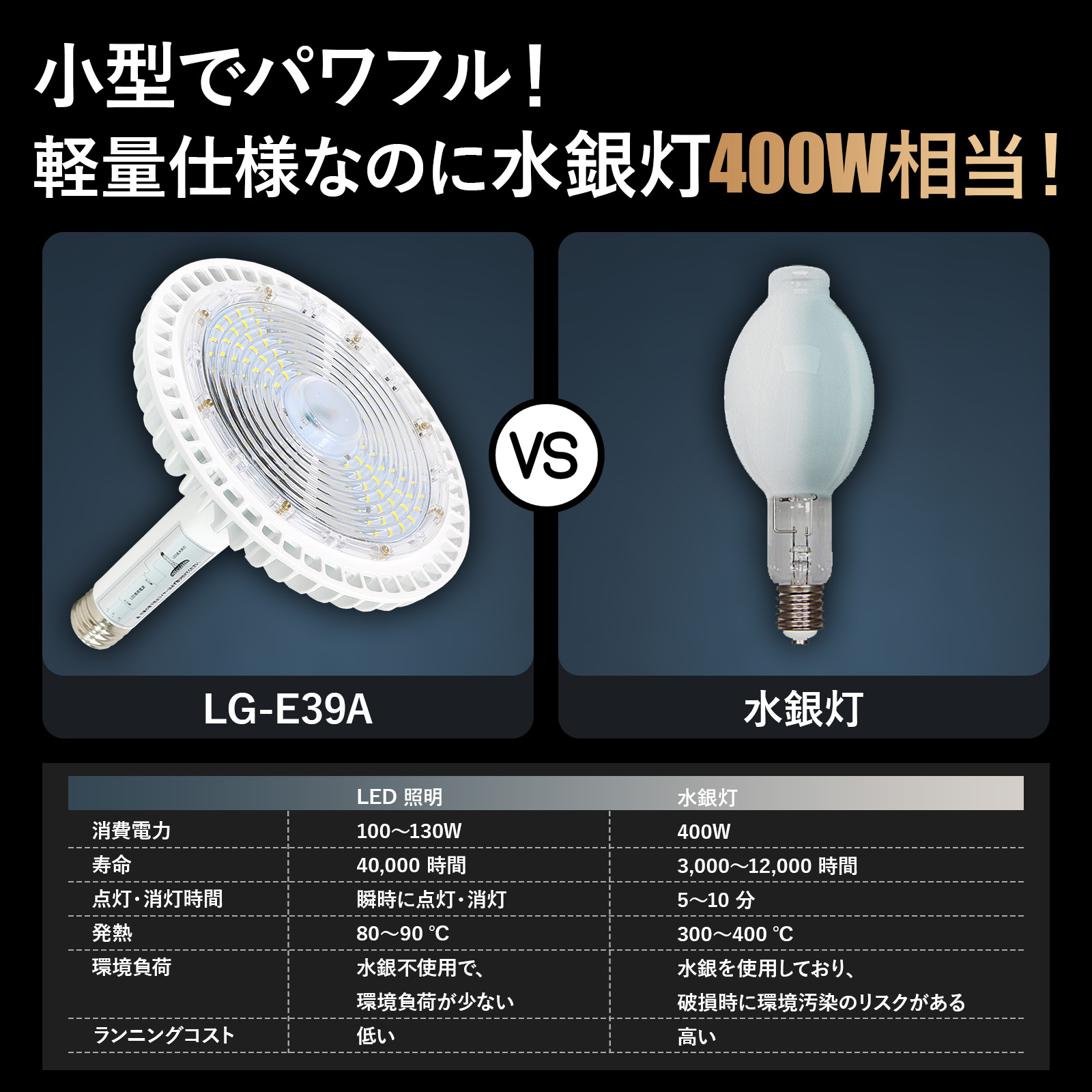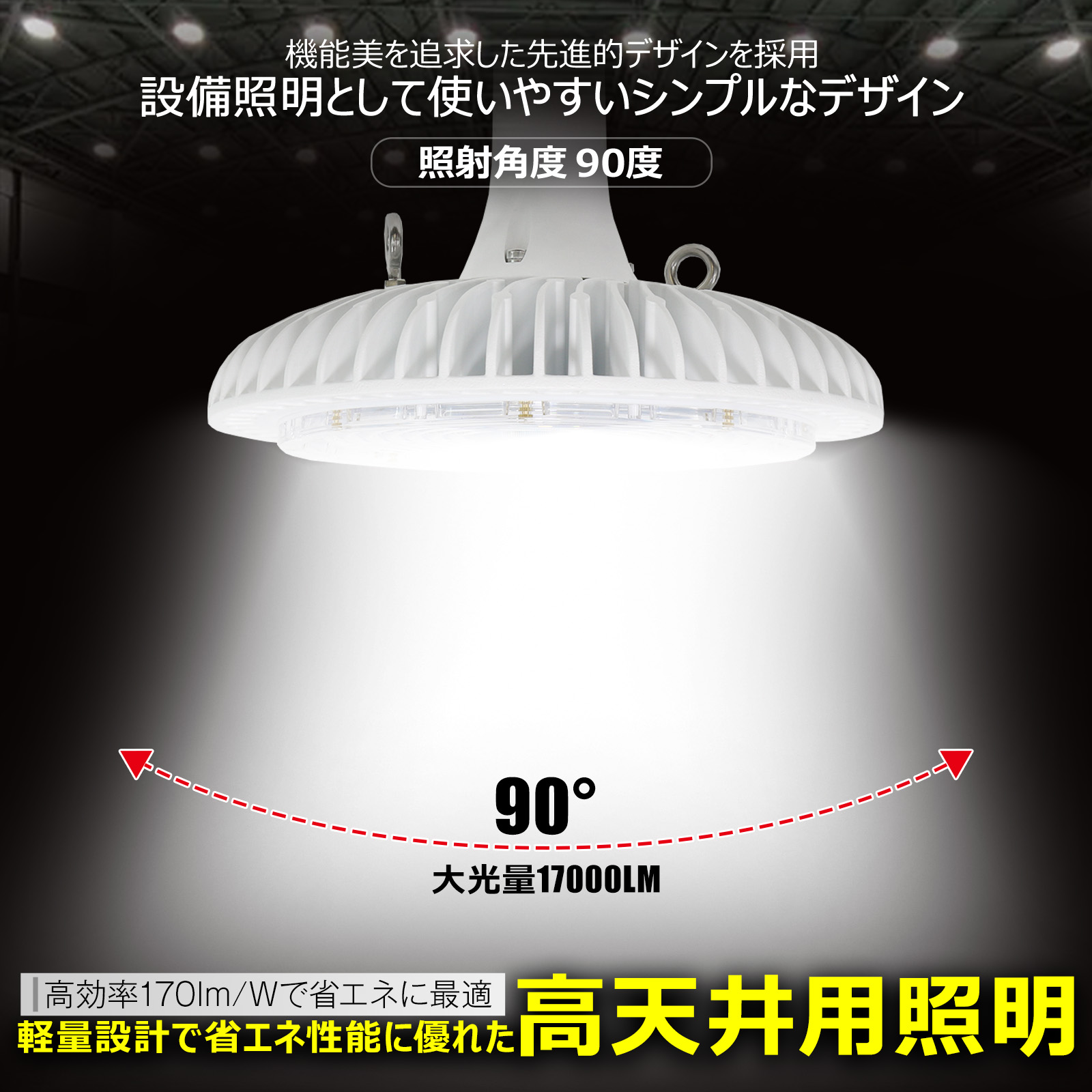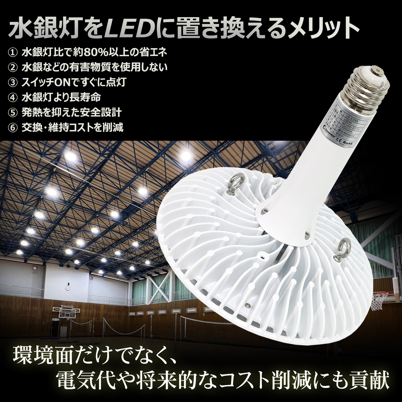 ★オススメポイント★ 特徴1 最大約85%の省エネ!従来の水銀灯に比べて消費電力が低く、長寿命であり、環境にも優しい。 特徴2 優れた散熱性を持ち、電磁波の干渉を防ぐ! 特徴3 落下防止ワイヤー(1m)付き! 特徴4 全光束16,000lmの高輝度を実現し、広範囲を明るく照らします。 特徴5 照射角度120°の広角設計により、広いエリアを均一に照射。高天井や広い空間での使用に最適です。 特徴6 IP65等級の防水・防塵性能を備え、屋外や過酷な環境でも安心して使用できます。