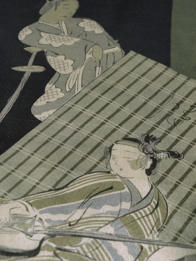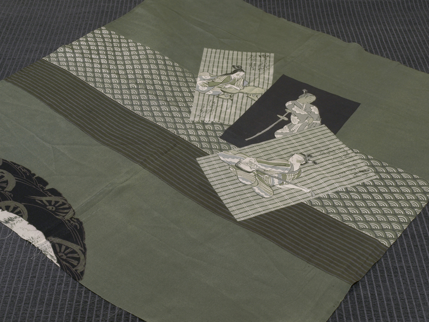 | 詳細 | 深く沈んだ苔(こけ)色の地によこ縞と青海波、人物の文様が染められた、羽二重の羽裏のハギレです。 おもしろみのある意匠です。下部には波に片輪車の文様が染められています。 中央と左右耳に縫い跡があります。また、右上に直径約 0.1~1mm の小穴が 2~3 か所、左上に直径約 1~2cm のうすよごれが 2 か所あるほか、全体のところどころにこまかな糸引きやくすみが若干あります。そのほかに目につく大きなしみやよごれ、褪色などのダメージはありません。 |