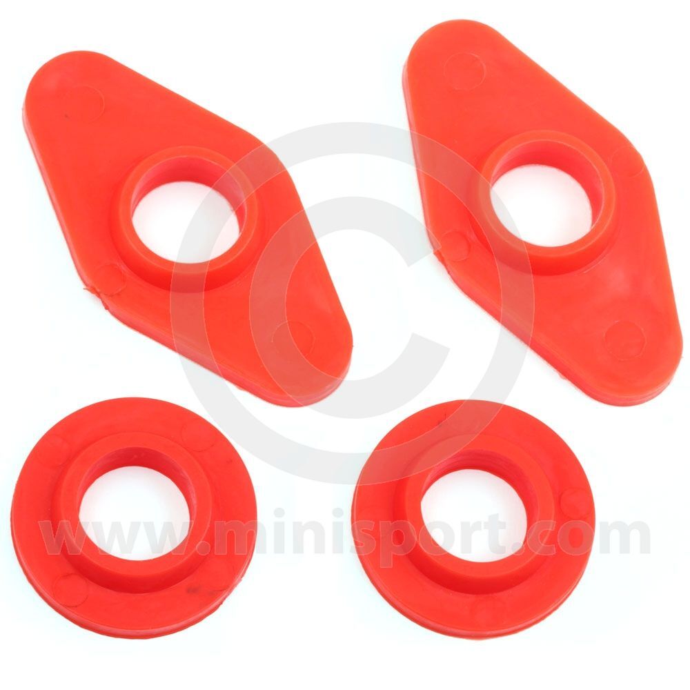 Uprated poly bushes in red for the Mini front subframe towers. Replaces the standard rubber bushes (KGE100050 & KGE100060) used on the big tower mounting bolt on the Mini from 1976 onwards.