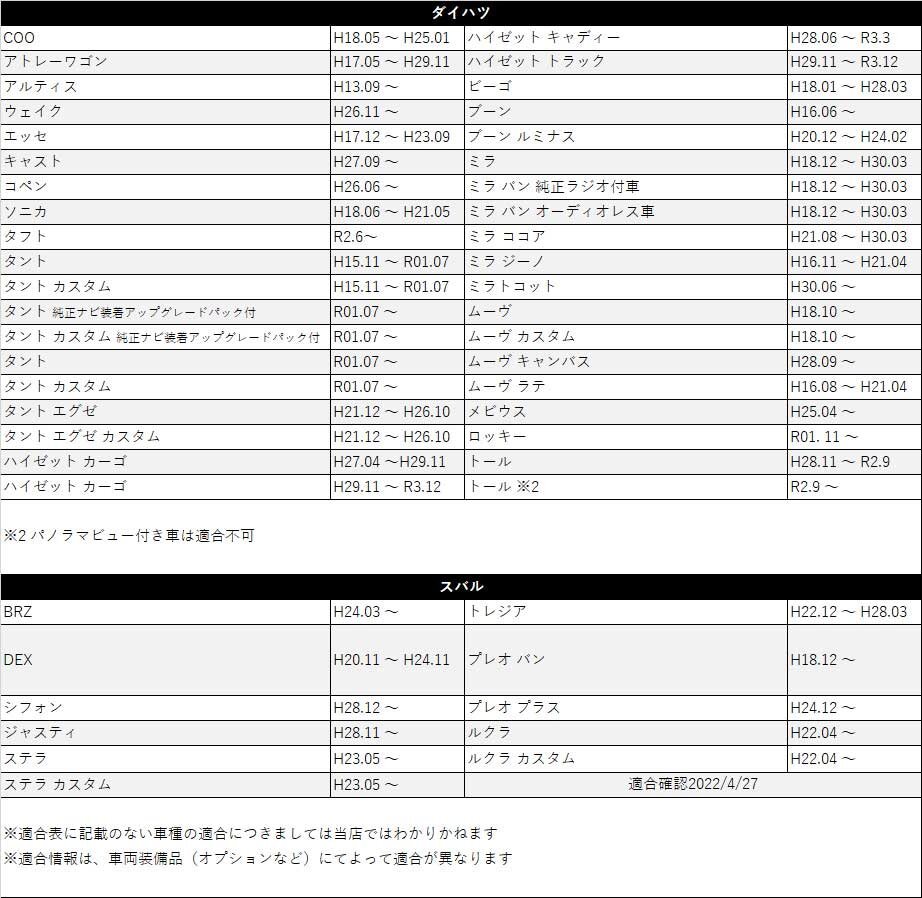 ![]() ■オーディオハーネス ワイドパネル セット 市販のナビ・オーディオデッキの取付に トヨタ・ダイハツ・スバル用 ワイドパネル付き。 ■オーディオハーネス ハーネス説明書付き 日本国内仕様カプラー トヨタ・ダイハツ・スバル車に社外品のオーディオ・ナビゲーションを取り付けるための配線キットです。 車両側のオーディオハーネスにカプラーオンするだけで社外品を取り付け可能な状態にできます。 接続端子を日本国内仕様としており、中国製品などによる寸法違いの抜け、接触不良を防止。 取付キットはバラバラにならないように一つに梱包しております。 トヨタ・ダイハツ・スバル車のオーディオカプラー形状10ピン&6ピンの車種に対応しております。 ディーラーナビ付き車及びオーディオレス仕様の車両に対応しています。 結線案内図・取扱説明書・保証書付き。 バックアップ(+B)、アクセサリ(ACC)、イルミネーション(ILLMI)を2極に分岐していますので、 ETCや後付けルームランプなどの取付に便利です。 ■注意事項 ・適合表はあくまで参考です。車種や年式、グレードによっては使用できない場合もございますので、適合につきましてはご落札様でお調べいただき、ご判断いただきますようお願い申し上げます。 ・幅広い車種に装着できるように設計されていますが、装着車種によっては使用できない場合がございますので、適合に自信のない方や作業に自信のない方は専門店などに依頼、相談することをお勧めします。 ・配線キットに車両側付属のオーディオステー(車両取付金具)は含まれておりません。 ・配線キットに車速・パーキング・リバースコネクタは付属しません。 ・他自動車制作会社の純正オーディオを取り付けることはできません。 ■ワイドパネルスペーサー ワイドサイズナビ・オーディオ枠に社外品ナビを取り付ける際に左右にできる隙間を隠す汎用パネルです。 車両側オーディオ取付枠の幅が20cmの車両にご使用ください。 画像のように左右1セットです。 ■注意事項 ・当商品に車両側付属のオーディオステー(車両取付金具)は含まれておりません。 ・車種や取り付けるナビ・オーディオによっては多少の隙間が空く、または使用できない場合があります。 ・記載の適合表はあくまで参考です。適合表に記載以外の適合情報は当店ではわかりかねます。 ・適合につきましてはご落札者様でお調べいただき、ご判断いただきますようお願い申し上げます。 ・ワイドパネルは、幅広い車種に装着できるように設計されていますが、装着車種によっては多少の加工が必要になる場合がございますので、作業に自信のない方は専門店などにご依頼されることをおすすめいたします。 ![]() ![]() |