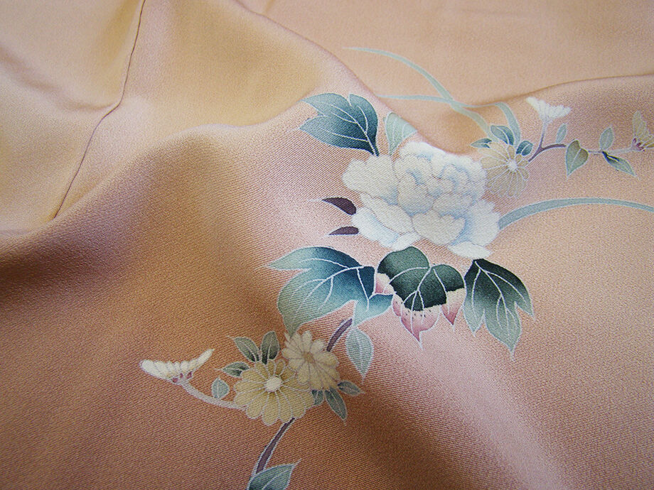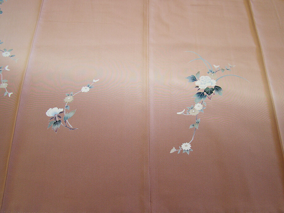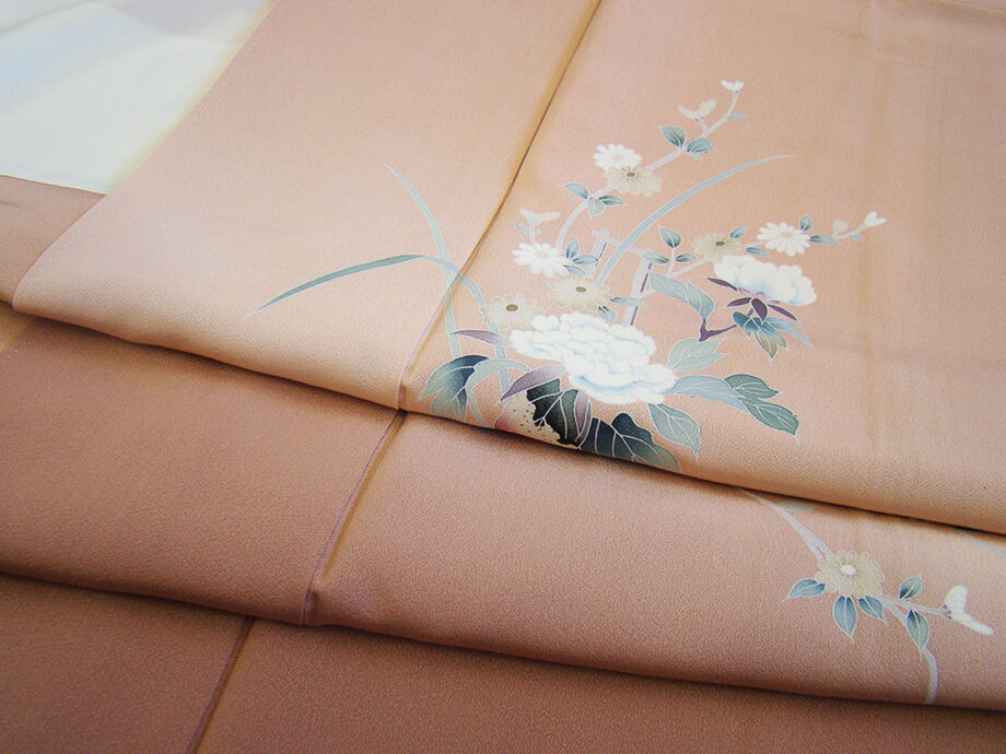 | 商品説明 | こちらのお品は「袷」ですので10月から5月までお召頂ければと思います。 とてもしなやかで柔らかな手触りの着心地良い重めの上質な極上ちりめん地の生地、 ときがら茶色地に裾にかけて退紅色ぼかしに花草柄の本加工染、 気品に満ち溢れた彩りが正統派のお着物として一枚は欲しい逸品の素敵なお着物です。 八掛は共布に柄入り(正絹)、背に「横木瓜」の刺繍紋1ヶ、幅広い年代の方にお召頂けます。 |