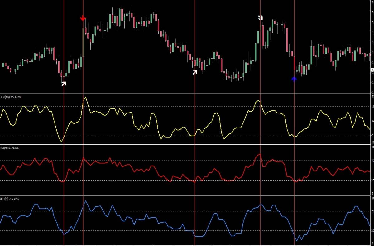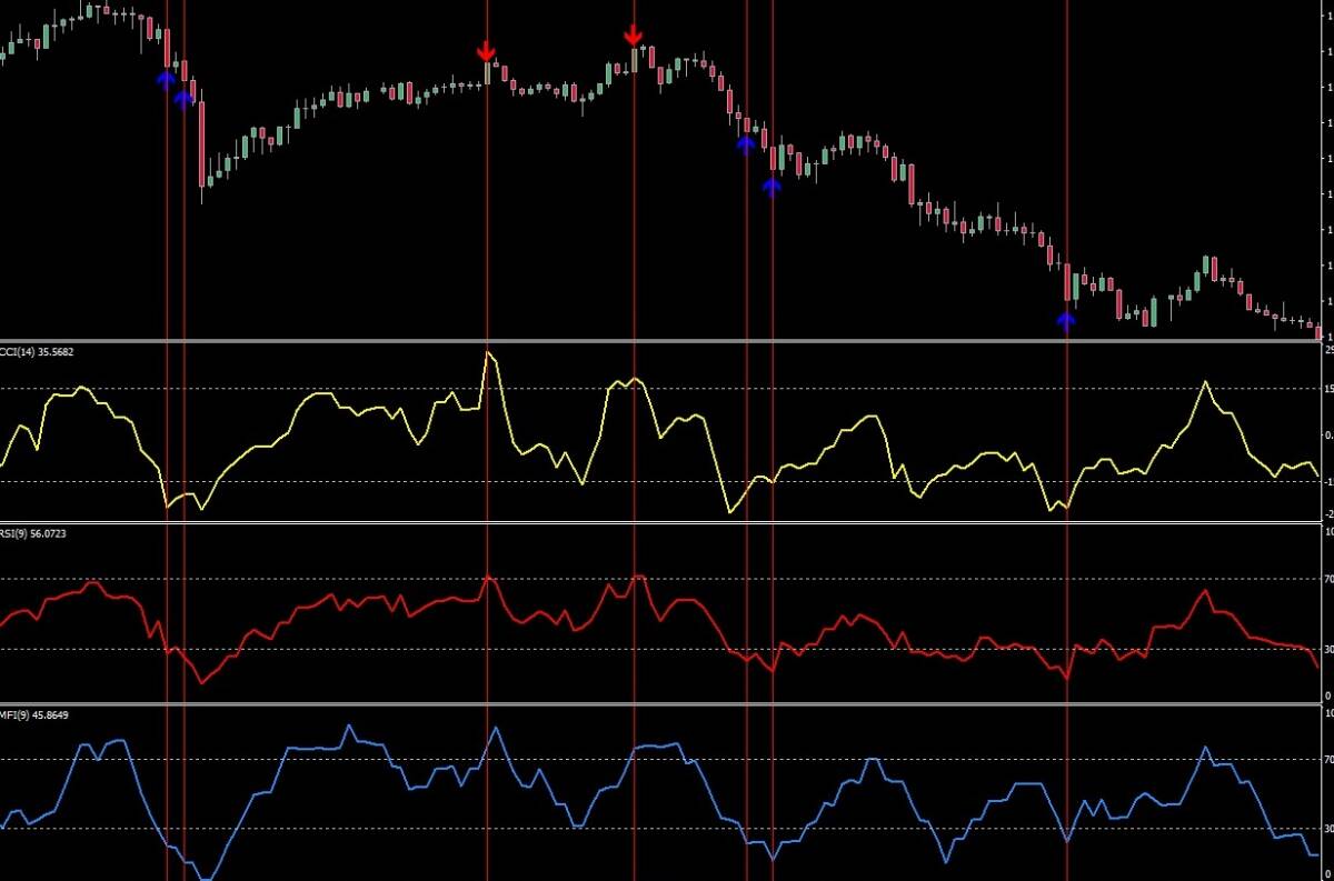※RSI(9)とMFI(9)は同方向、CCI(14)だけ逆方向に傾いた時サインが出ます。