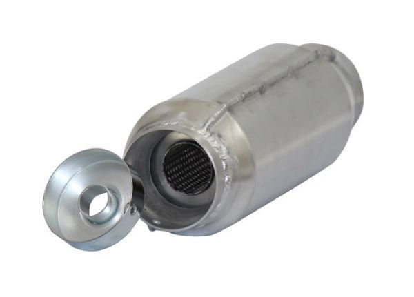 | 商品詳細 | 70φショート管をモナカ管に♪ エンドバッフルの取り外し可能。 【商品サイズ】 全長約:310mm 外径約:102mm 内径(排気口)約:23mm(バッフル有)、36mm(バッフル無) マフラー差込口約:70.8mm |