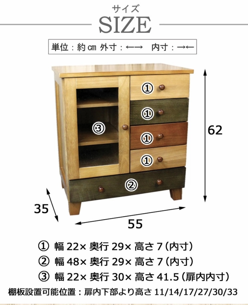 ◆◇商品詳細◇◆ ウッド七段チェスト+ガラスキャビネット 落ち着きのあるシンプルな多引出しチェスト二点セットです。三色の温かみのあるお色の天然木桐製タンス。桐材無垢板使用で、軽く、持ち運び、移動も楽々です。北欧カントリー調の素敵なデザインがどんなお部屋にもぴったりとマッチします!収納力抜群で小物収納に最適です。ブラウン、ライトブラウン、グリーンブラウンのカラーがとても素敵です!アジアン、洋室、和室どんな場所にもよく合いそうですね。二点セットの価格になります。 【商品状態説明】 小キズあり、まずまずの美品。 完成品になります。 【サイズ】 (ガラスキャビネット) 本体サイズ ・・・・ 幅55cm×奥行35cm×高さ62cm 引出内寸サイズ(小) ・・・・ 幅22cm×奥行29cm×高さ7cm 引出内寸サイズ(大) ・・・・ 幅48cm×奥行29cm×高さ7cm 扉部内寸 ・・・・ 幅22cm×奥行30cm×高さ41.5cm (縦長タイプ) 本体サイズ ・・・・ 幅35cm×奥行35cm×高さ81cm 引出内寸サイズ(1~6段目) ・・・・ 幅30cm×奥行29cm×高さ6.5cm 引出内寸サイズ(7段目) ・・・・ 幅30cm×奥行29cm×高さ8.5cm 【素材】 木製、桐材無垢 【カラー】 ブラウン | ◆◇発送方法◇◆ ●送料は基本無料ですが、沖縄・離島などにお住まいの方はご負担ください。 (沖縄・離島の方はメールにてご連絡いただければ、送料をお知らせいたします。) ●ヤマト運輸・佐川急便・第一貨物のいずれかにて配送いたします。 (運送会社の指定はできません。ご了承ください。) ●日時・時間指定のある方や、お問い合わせ(追跡)番号をご希望の方は取引連絡の際にお知らせください。 | |