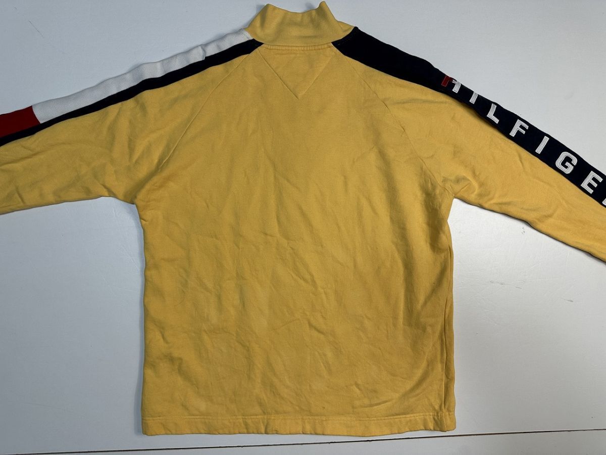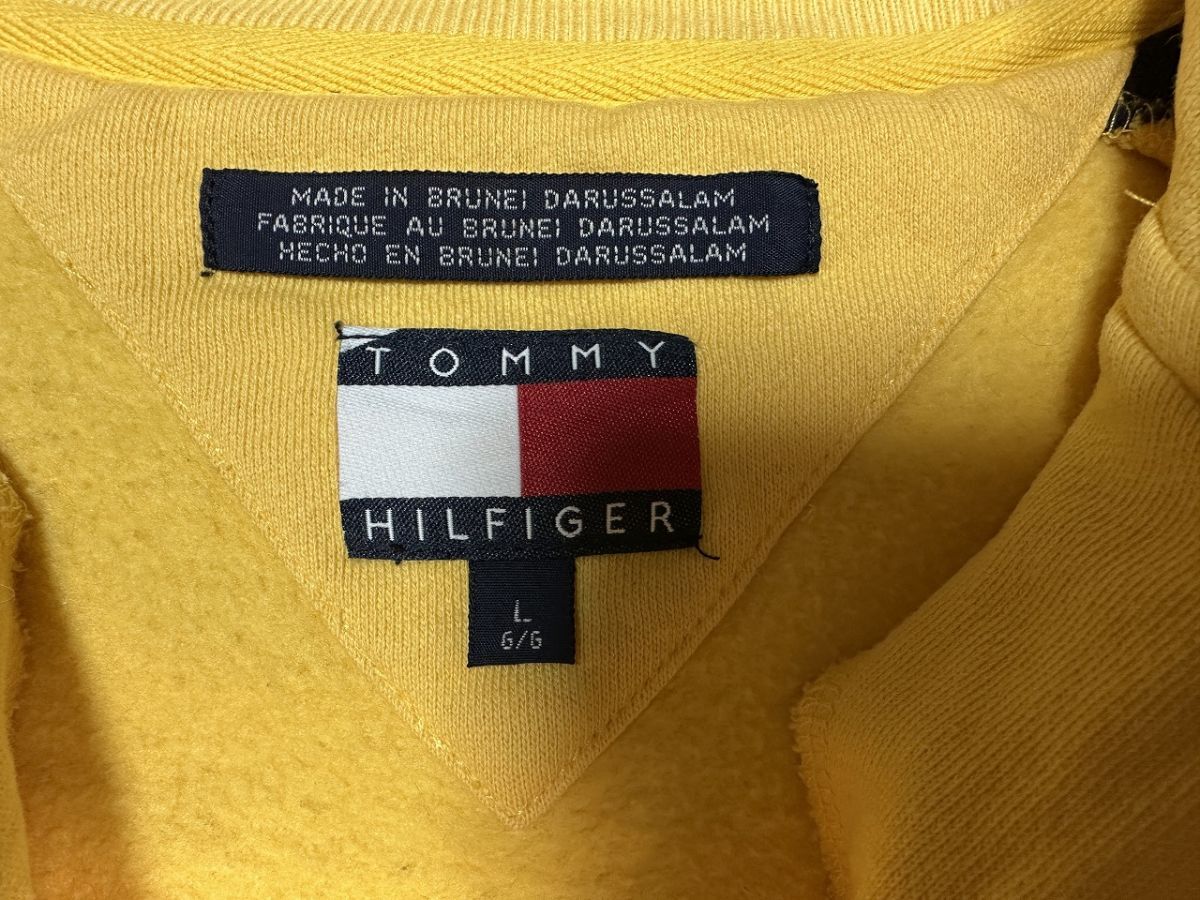 ●US USED TOMMY HILFIGER トミーヒルフィガー ハイネック スウェット 袖ライン 文字刺繍 ロゴ刺繍 イエロー黄 裏起毛【L】