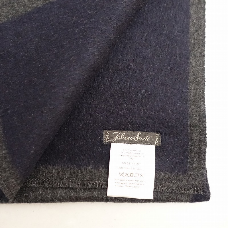 | Faliero Sartiのシルクマフラーです。カラーはチャコールグレー×ネイビーで、裏表でカラーが反転しており、レザーのロゴがあしらわれています。 |