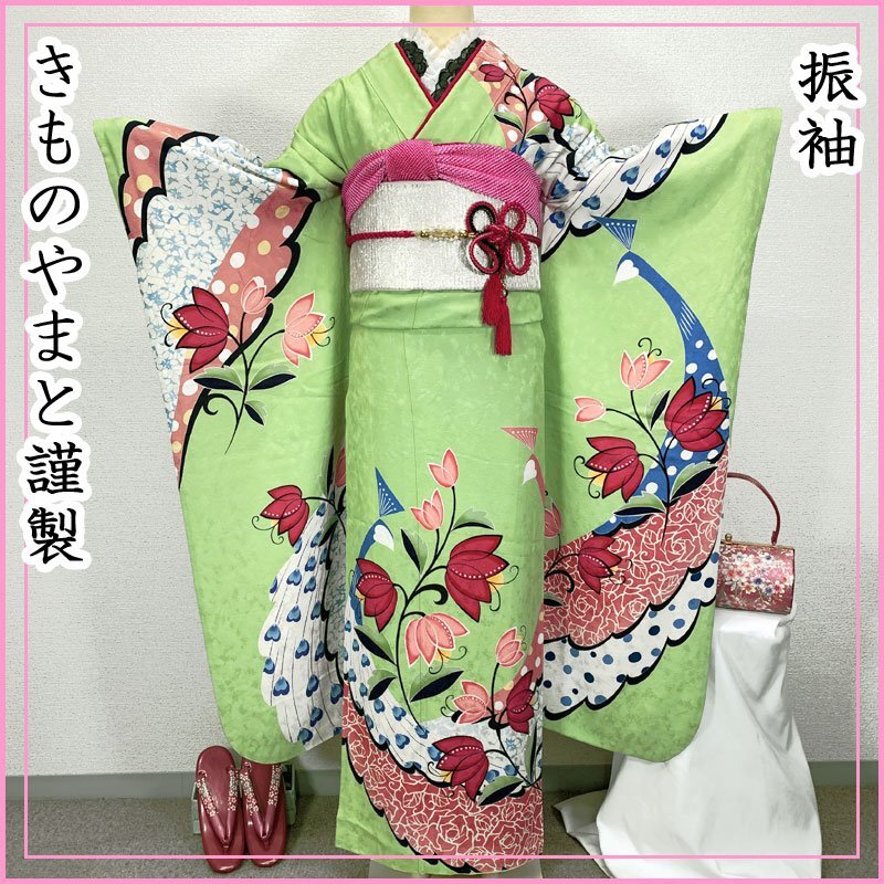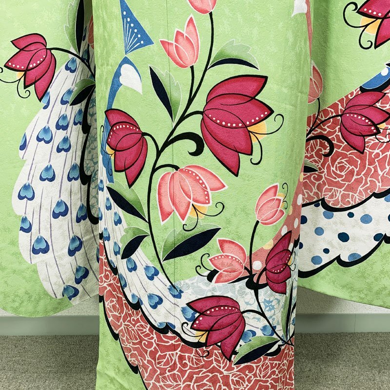 | ☆個性的!きものやまと 振袖 地紋 孔雀 クジャク エスニック 黄緑☆美品 成人式 結婚式 (No.eid) きものやまと謹製。黄緑色の地に、大きく翼を広げた孔雀が印象的な振袖です。地には斑な地紋が施されています。ほか方と被ることのない、個性豊かなデザインです。 こちらの商品は振袖のみで、画像の袋帯510y3、重ね衿、帯締め、帯揚げは参考商品ですが、在庫がある場合に限り+20,000円で振袖とセットでお譲りすること可能です。半衿は私物のためお譲りいたしかねます。草履バッグセット406v49は参考商品です。 画像6枚目のように左内袖に小さな穴が数か所ございますが、遠目には分かりません。ほか若干の使用感やシワはあるものの、特に目立つようなシミ・ダメージはなく美品です。 【表地素材】正絹(胴裏は化繊) 【色】黄緑、マゼンタ系、青など *モニターによって色味は実際と異なる場合がございます。 【サイズ】