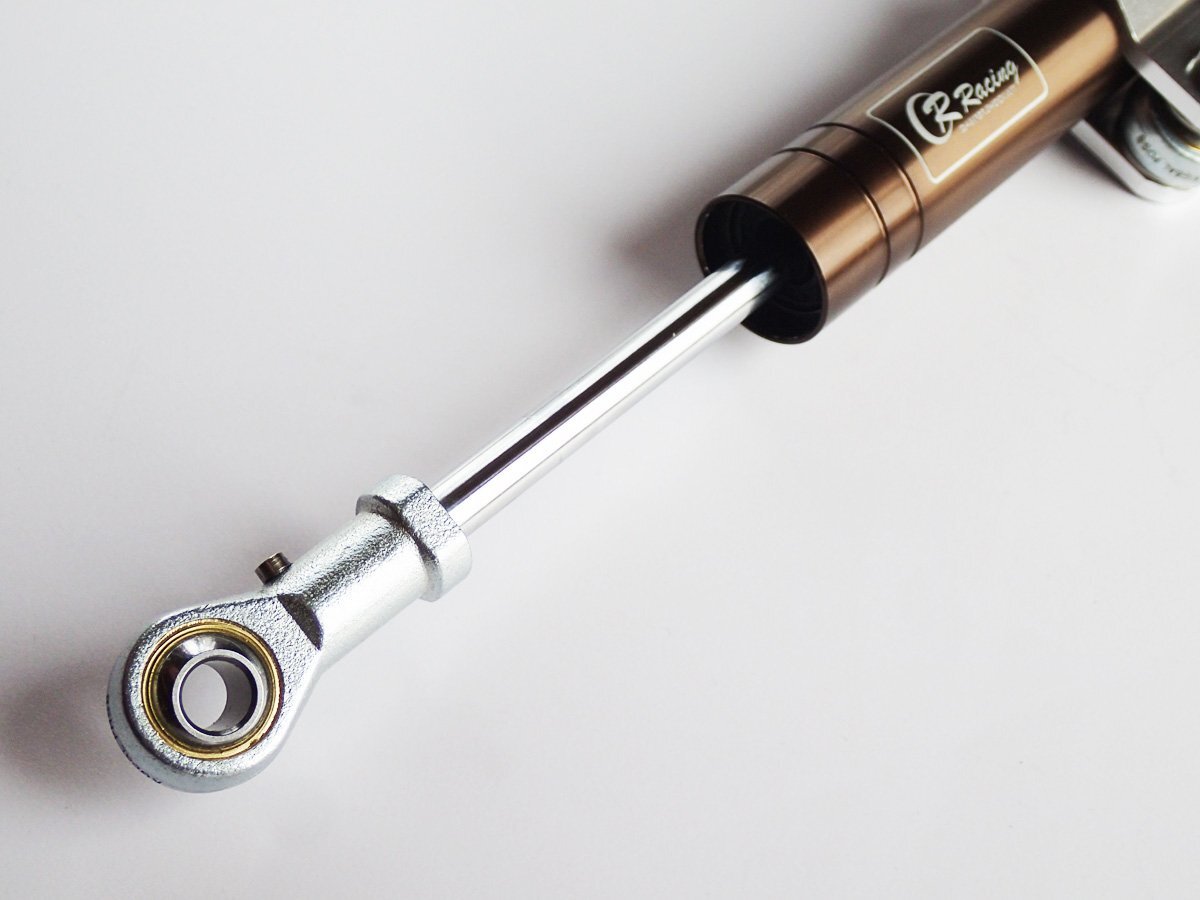 汎用品ですのでいろいろな車種に対応できます。 車体に合わせたフィッティングを御用意下さい。(ストロークに応じてどの位置においてもロッドを斜めに押さない様に取り付けてください) 全長400mm、ストローク135mm、ボディー側取り付けボルト径8mm、ピロボール穴径8mm、ロッド径8Φ 7段階アジャスト機構付 ボディーの外径は25mmです。 ロッドエンドはピロボールタイプですのでL型にボルトが固定されたタイプよりも強度が強く耐久性があります。中大型車用に丁度良いサイズです。 色はチタンカラーです。