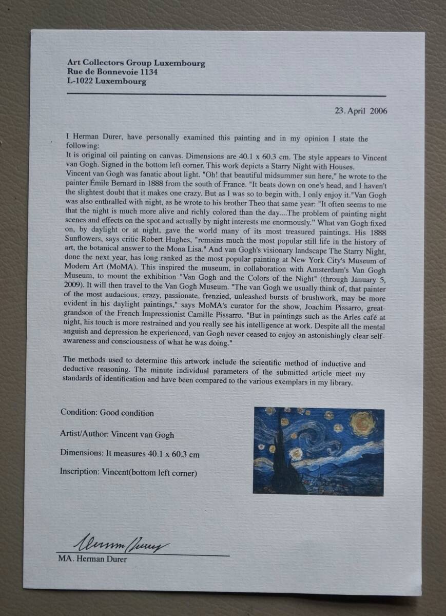 | 商品説明 | ファン・ゴッホの油彩/キャンバスの肉筆原画です。1889年にサン・レミで描いた代表作の1つ「Starry Night(星月夜)」(油彩/キャンバス、73.7 x 92.1cm)の習作として描いた一枚と思われます。出品作品は本作と比べると、筆致はややラフですが、構図、色彩ともほぼ同様の描写で、本作と同様に広がる空、煌めく星、渦巻く雲、色彩豊かな家々が織りなす幻想的な作品になっています。左下にでサイン(Vincent)が書かれています。経年による汚れがかなりあったので、油彩専用リキッドでクリーニングしましたが、ご覧のようにまだ汚れが残っています。ご承知のうえ入札をお願いいたします。 ルクセンブルク公認美術団体「ルクセンブルク・アートコレクターズ」発行の鑑定書が付属し真作であることを示しています。 制作年:1889年 サイズ:約40x60cm ***重要!額縁代金のうち5000円を補助!即決購入は額縁、送料とも無料!*** 「額縁は自分で選びたい」「同じサイズのを持っているので額縁は不要」などの声がこれまで多数ありました。その要望に答えて出品作品に額縁は付きません。額縁が不要な方はそのまま作品のみを購入してください。落札者で額装を希望する落札者は、以下のいずれかを選択してください。 (1)当方取引先の額縁専門店「マルニ額縁店」(栃木県)がHPで販売している中でお好きな額縁を選ぶ (2)写真掲載した額装例3点のうちお好きなものを選ぶ (3)当方にすべて一任する いずれでも購入金額のうち5000円を当方が負担します。なお、サイズや装飾などによって額縁の金額はピンからキリですが、この作品のような約60x40cmの場合は標準的なもので29000円ほどになります。この金額から5000円をお引きします。したがって落札者の負担額は24,000円ほどです。 また、即決で落札いただいた場合は、上記3点の額縁のうちお好きなものを無料で提供します。送料も無料となります。 なお、落札後はお名前、住所等の入力と同時に、額縁の要不要や額縁選択をお知らせください。その後こちらから送料を入力しますので、それまでご入金はお待ちください。 |