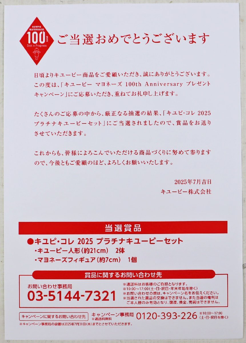 | M◎中古品◎『キユピ・コレ 2025 プラチナキユーピーセット』 キューピー キユーピーマヨネーズ100th Anniversary 当選通知書付き 非売品 (1050274T) ※中古品です。 『キユピ・コレ 2025 プラチナキユーピーセット』 キューピー キユーピーマヨネーズ100th Anniversary 当選通知書付き 非売品 ◎外観 輸送箱はキズやスレ、ヨゴレ、破れがあります。 箱はキズやスレがあります。 人形本体に目立ったキズやヨゴレ等はありません。 当選通知書はヨレがあります。 ◎付属品 ・輸送箱 ・箱 ・当選通知書 ※商品写真に掲載したものが全てです。 | ||