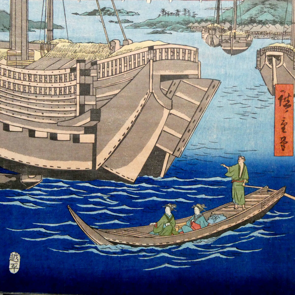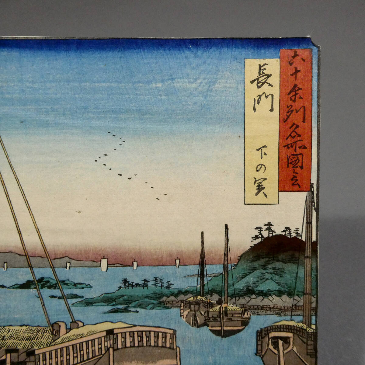 ■ 初代歌川広重 江戸時代 木版浮世絵 「六十余州名所図会 長門 下の関」 盛況の港 樽廻船 遊女の小舟 ■
