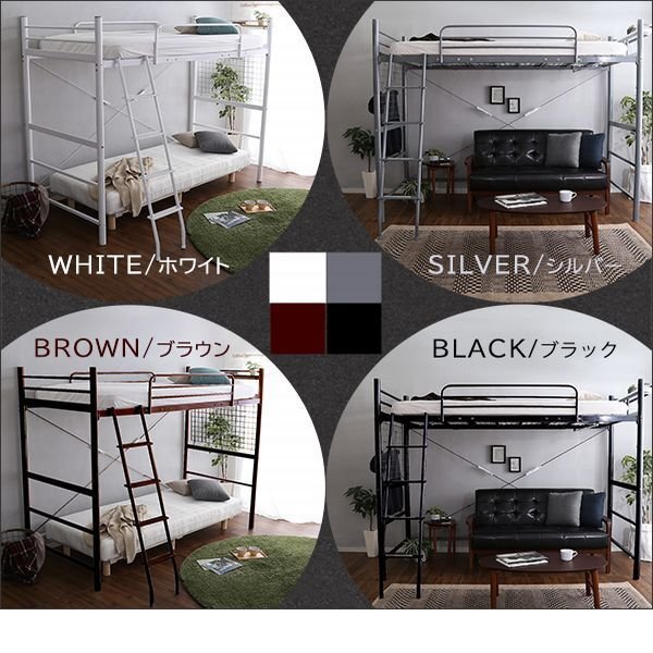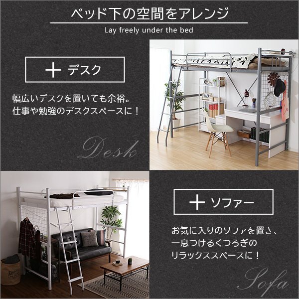 | 【ポイント】 ①コンセント付きの宮棚が付いて、ハイタイプ・ミドルタイプに高さ調整が出来るロフトベッドです。 ②丈夫なパイプを使用しており、通気性が良くカビに強い仕様となっているので安心・安全です。 ③ベッド下の空間を自由に使えるのがロフトベッドの最大の特徴で、自由なレイアウトをお楽しみ頂けます。 |