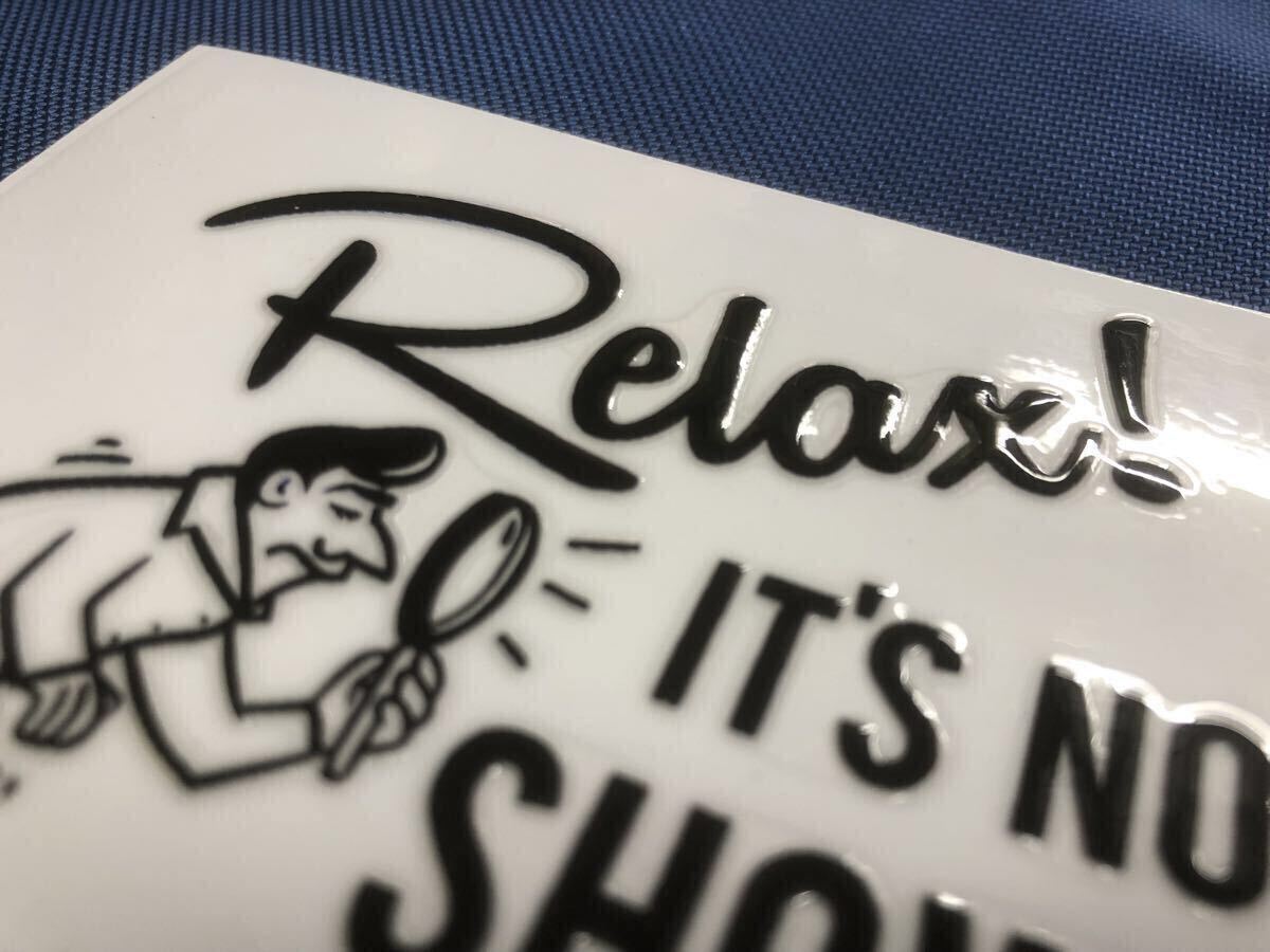 アンチヘイター(悪口言う者に対抗) ステッカー。 "Relax! it's not a showcar" 意味は ”落ち着け! ショーカーじゃないよ。” と他人の車を見て批判する人に向けてのステッカーです。虫眼鏡を使って粗探しする様がディスっていてユーモアありアメリカらしいステッカーです。黒の部分のみが残るタイプですがカッテイングシートタイプの切り文字ステッカーとは異なり、ぷっくりと厚みがあり高級感のあるステッカーです。発送は85円~でお送りします。