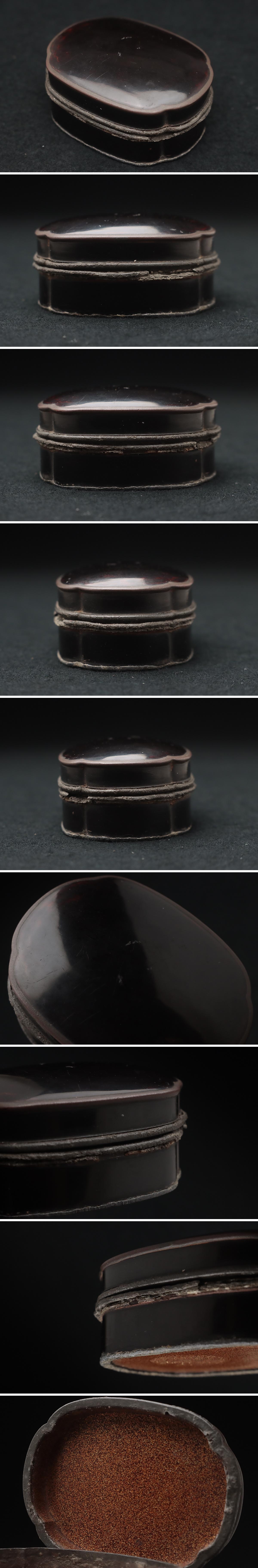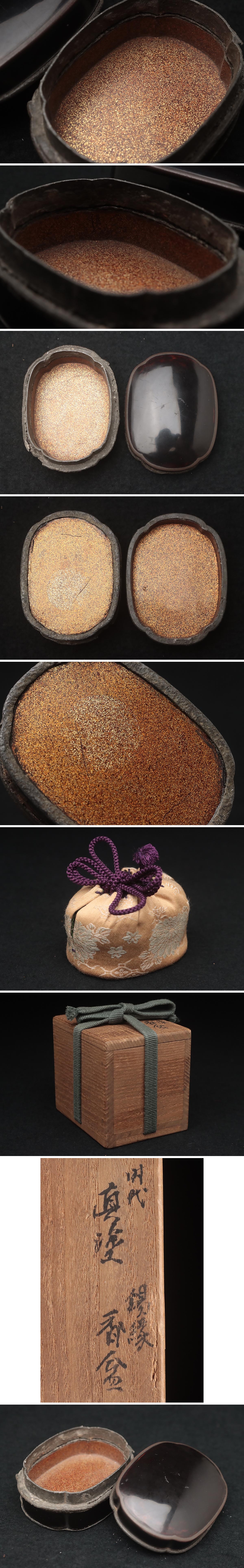 | ◆ 時代 真塗 内金梨地 錫縁 木瓜形香合 幅6.4cm 仕覆 木箱附・内梨子地黒漆錫縁香合・香盒 茶道具 古美術 ◆