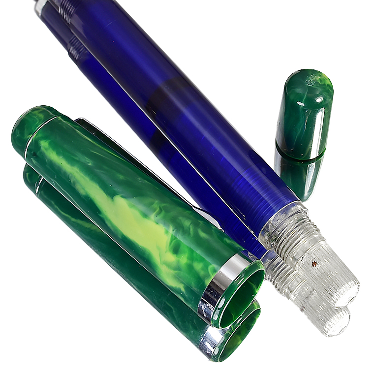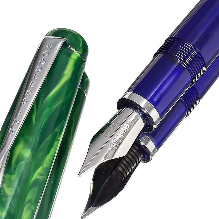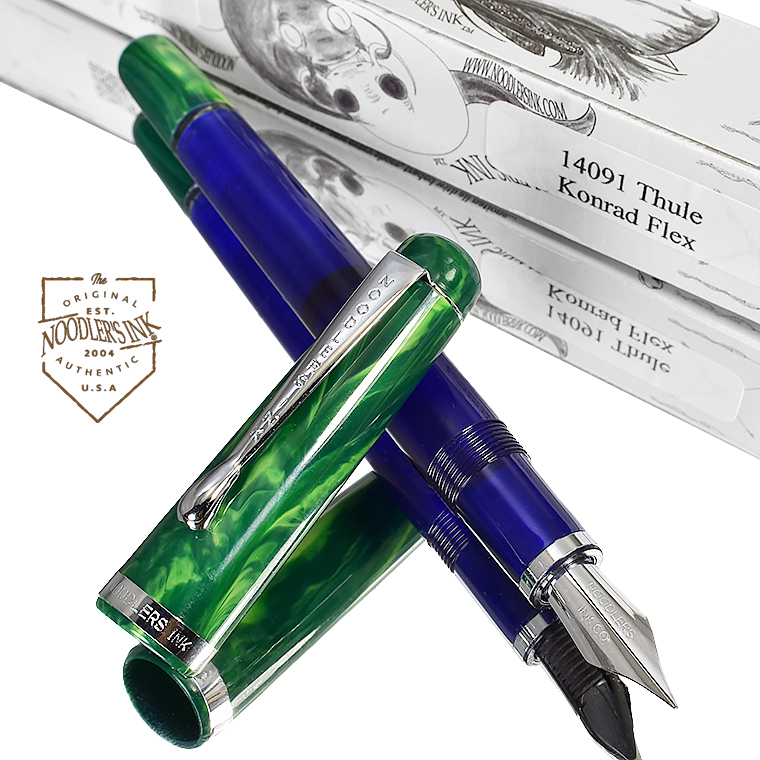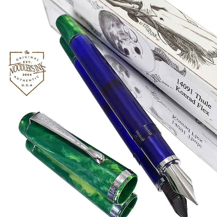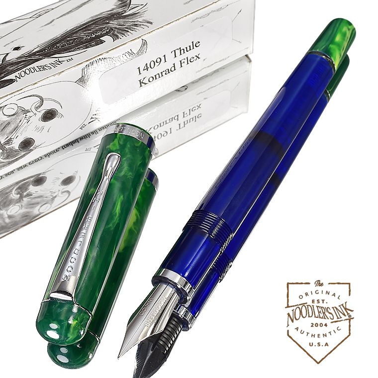 | 【NOODLERS INK/ヌードラーズインク】万年筆 「フレックスニブ」シリーズ 万年筆 「Konrad」シリーズ "14091 Thule"NOODLER'S INK” 文字幅を自由自在に書き分けられるフレックスニブ万年筆、 漢字やひらがなを書くのに適していますよ、このフレックスニブ! ![]() 万年筆の中でも特に表情豊かなラインを引くことのできる特殊なペン先を持った万年筆を ご紹介いたします。 今回、私たちhunnyhuntjpがお薦めするのは「フレックスニブ」システムを持つ万年筆です。 この万年筆は、私たち同様に柔軟性の高いペン先に魅了されたアメリカ合衆国テキサス州の 会社「NOODLERS INK」社が造っている Konrad シリーズ「Thule」です。 彼らのこだわりは「ニブ=Nib」はもちろんのこと、 そのニブを支える独自の「ペン芯=Feed」にもあり、独特な柔軟性を備えたこの会社のオリジナルで、 「ニブ」と「ペン芯」を合わせた「フレックスニブシステム」を 考案制作したところに面白さがあります。 私は自社ブランドのNIBを開発していく過程で、世界の様々な万年筆が作られてきた歴史を研究し、 その中でオリジナルとして開発されてきた様々なNIBを入手しテストしてきました。 その中で、特に注目しているのが、特別な「しなり」を持ったNIBたちなのです。 そこで、フレックスNIBと呼ばれる特徴的な書き味を持ったニブに注目したのです。 ご存知の方もおられるでしょが、「フレックスニブ」は新しいものではなりません。 既に欧米の名だたる有名メーカーにもあります。 しかしながら、これらは強いて言えば「セミ・フレックスニブ」といい、 フレックスの幅に制限があるタイプなのです。 ![]() フレックスニブは、欧米の名門万年筆メーカーにとっても長年開発を続けているものなのです。 ビンテージ万年筆にもフレックスニブを備えたものがあり、今も注目されています。 私が求めているのは、こうした歴史を踏まえながら現代の技術と素材で作る 「フル・フレックスニブ」なのです。 誰でもが万年筆のより自由な書き心地を楽しめるように、 筆圧に応じて自由自在に文字幅に変化をつけて文字表現を楽しめる、 そういうフレックスニブです。 フレックスニブのクローズアップ ニブの開き具合文字の太さ ![]() そして出会ったのが、前述したアメリカのブランド「NOODLERS INK」の 「フレックスニブ」だったのです。とにかく面白しろいニブです。 そのタッチは独特で、あまり目にすることのないものです。 やや硬めのタッチで、通常はそのままで小さな文字も書けますし、 筆圧をあげれば、2mm字幅ぐらいまで太く書き分けられます。 使い慣れると、これぞ万年筆と感じる人が多くいるのも特徴で、 万年筆の楽しさから抜け出せなくなる書き味です。マニアックですが、かなり魅力的なのです。 ペン先が紙に触れた瞬間の感触。指がペンにかけた圧力を押し返すニブの弾力。 その柔らかな反発力、わずかな力加減で、開いたり閉じたりするニブのスリット切れ目。 その切れ目を流れるインクが、小さく開いたり閉じたりするスリットの中で張力によって 広がるインクの動き、ペン先の動きに合わせて細い線からス-と太くなったり、 クモの糸のような細いラインになったり、紙の上にリズミカルに流れ出るインクのライン。 流れるような筆記体の文字を書くことができます。 この書き味は、線の太さに変化を付けると美しく見える「ひらがな」そしてもちろん漢字の表記に 丁度良いのです。アルファベットの筆記体にもいいですね。 最近の義務教育では、アルファベットの筆記体を習わなくなったと聞きました。 とても残念に思います。私は、アルファベットの筆記体や日本の行書体が好きです。 字の持つ意味だけではなく、文字の書かれる形状やスピード感、そこに感じる力の強弱が、 その字をその文章を書いた人の伝えたい気持ちを見た瞬間に感じることができる気がするからです。 気持ちのこもった文章とは、そういう書き手の息遣いが感じられるものですよね。 ![]() 今回ご紹介する「フルフレックスニブ」シリーズ 万年筆の 「NOODLERS INK」のKonradシリーズ FlexNibは、 デザイン的には1940年代の大戦後の復興ドイツ時代いわゆる「アデナウアー時代」を 回顧した典型的なドイツデザインが用いられています。 だから極めてオーソドックスであり機能的な印象のフォルムになっているのです。 ペン先は、NOODLERS INK オリジナル「フルフレックニブ」 大きめ6号サイズで、 「NOODLERS INK CO」の刻印が唯一の装飾です。ボディサイズとも合っています。 ![]() 吸入方式はピストンフィラー式で、円滑に動かせために特殊なシリコングリスが塗布されています。 このシリコングリスですが、スパイシーでちょっと独特な匂いが致しますのでご了承ください。 尾栓のキャップを回し外して、エンド部を回転させてピストンを前後に動かすのです。 フレックスニブはスタンダードなニブよりもインク使用量が多くなるので、 たっぷり入れられるこの方式が採用さ