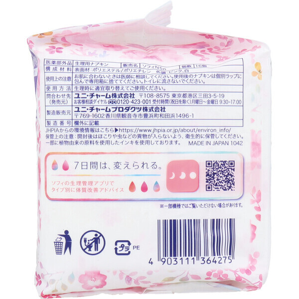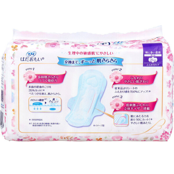ず~っと肌さらさら。 生理中の敏感肌にやさしい。 交換まで、ず~っと肌さらさら。 ・長時間さらさらつづく吸収力。 表面の経血残りを35%カット! べたつきを抑え、肌さらさら。 (かたまりを含む極端に粘度の高い経血は吸収できません。) ・ふんわりやさしい肌ざわり。 従来品よりシートのふんわり感を150%にアップ! ・低刺激ふんわり立体ギャザー搭載。 肌にあたる力を約1/10にカット※ やさしい肌あたり。 ※ユニ・チャーム社従来品比 個装サイズ:180X105X102mm 個装重量:約140g 内容量:16個入 製造国:日本 【発売元:ユニ・チャーム株式会社】 【医薬部外品】 生理用ナプキン 販売名:ソフィN5n 【構成材料】 表面材:ポリエステル、ポリエチレン 色調:ピンク、白 【使用方法】 ・生理時に適宜取り替えてご使用ください。 【使用上の注意】 ・お肌に合わないときは医師に相談してください。 ・使用後のナプキンは個別ラップに包んで専用箱に捨ててください。 ・トイレに流さないでください。 ★保管上の注意 ・開封後はほこりや虫などの異物が入らないよう、衛生的に保管してください。 注意事項 ※予告なく成分・パッケージが変更になることがございます。 予めご了承ください。 *予告なく成分・パッケージが変更になることがございます。予めご了承ください *ダンボールを使用して発送する場合には、入数以下の個数の場合、 中古ダンボールを使用する場合があり、ご注文の商品とは異なるダンボールになる場合があります。 あらかじめ、ご了承ください。 |