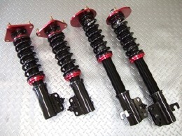| Largus車高調のスタンダードモデルとして、街乗りはもちろん、ワインディングやサーキット等でのスポーツ走行まで幅広く対応出来る扱いやすい特性を持ったSpecS。適合は300車種以上、他メーカーではラインナップされていないようなコアな車種や絶版車まで対応。 1:車種別設計アッパーマウント ピロ式・強化ゴム式・アッパーレス式の3タイプからそれぞれ車種に適した形状を採用。 2:アッパーシート 通常のタイプからベアリング付き・スラストベアリングと車種に合わせたアッパーシートを採用。 3:高剛性スプリング スプリングは性能と耐久性を重視し、SAE9254を採用。62Φの内径を基準とし、一部車種には巻数や線形を変えた専用のテーパースプリングを用意。 4:リング 高剛性なジュラルミン製リング。大口径ショックにはベベルエッジリングを、ストラット車にはスチール製リングを採用して更に強度を高めている。 5:車種専用ロアブラケット 全て現車でフィッテング確認済み。スピンドルタイプの車種用ブラケットには、スピンドルが付属している為、純正スピンドル下取りなど面倒な手順の必要がない。 |