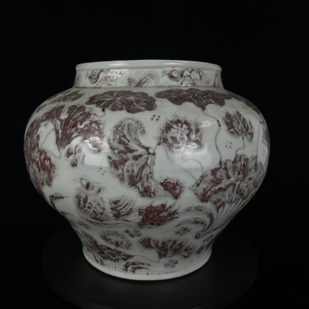 中国磁器 陶芸 磁器『元代の釉里紅鴛鴦戯れ水紋入り大壺です』施釉陶 古代工芸品 陶芸 精美彫 置物 收藏品 | |||
