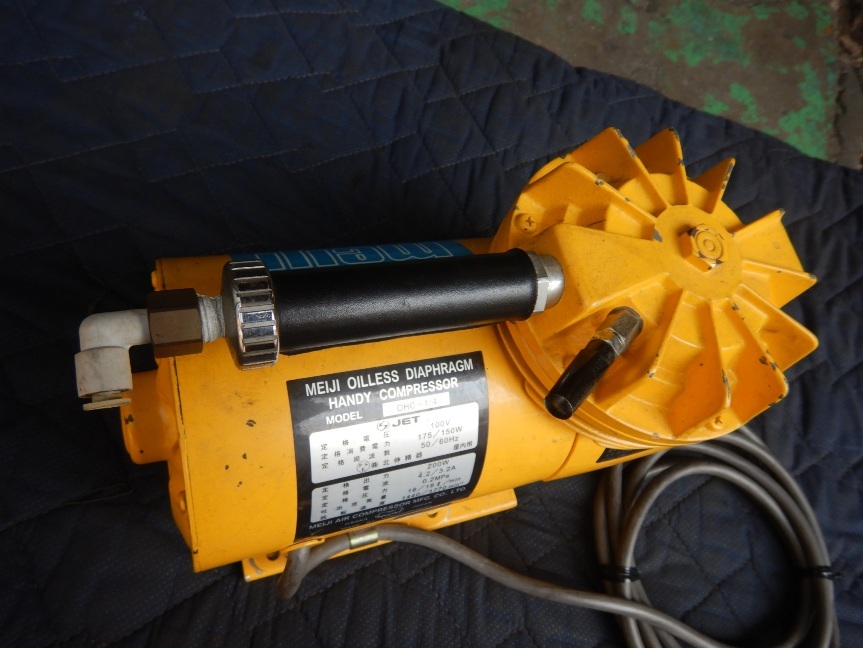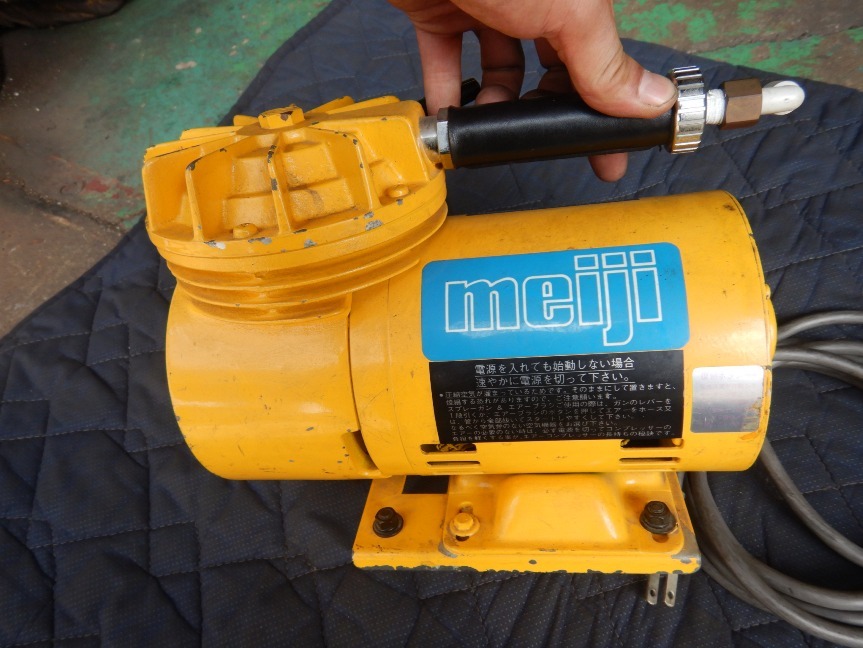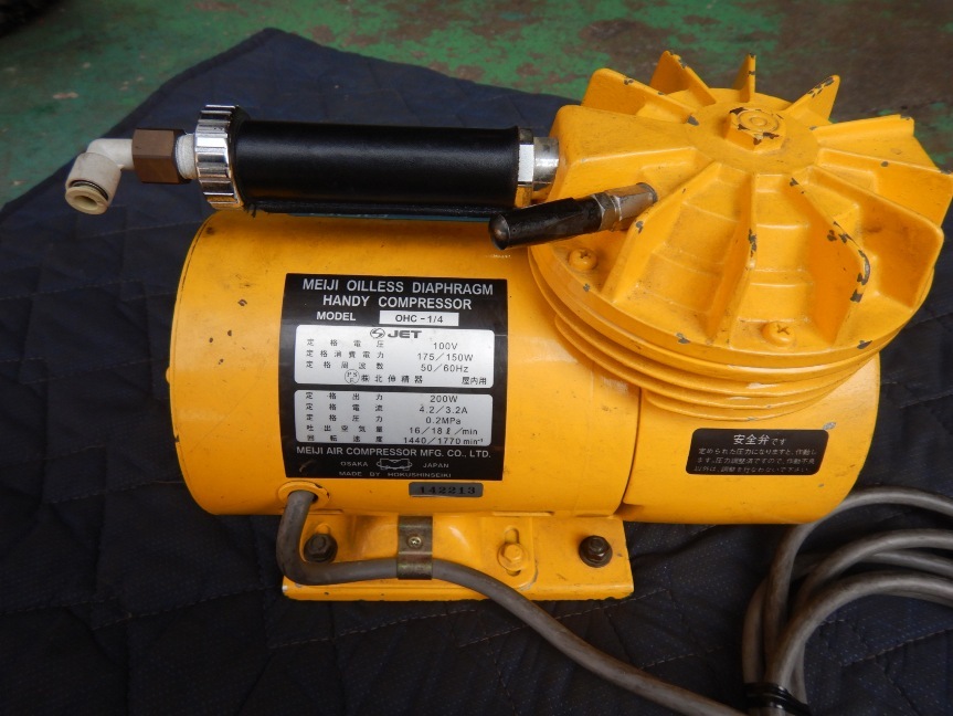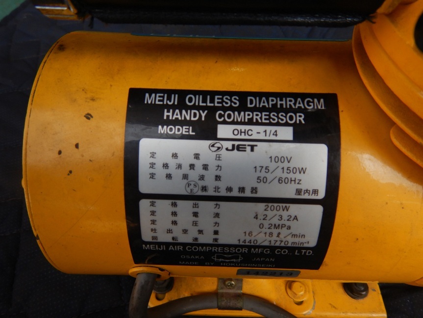 | 即決税込 中古保証付 明治 オイルフリー コンプレッサー OHC-1/4 ================ 明治 コンプレッサー OHC-1/4 電源 100V 周波数 50/60Hz 消費電力 175/150W 定格出力 200W 定格圧力 0,2MPa タンクなし 回転数 1440/1770回転 吐出量 16L/18L/分 重量 約10kg 全長 約290mm 電源を入れると 吐出口からエアが出ます。 吐出圧は0,2MPaで一定で タンクはなく、ONOFFスイッチも ありません。 ただエアが出るのみです。 異音もなく 動作に問題ありません。 ================ 即決ですので入札=落札です。 落札価格は消費税込みの金額です。 早いもの勝ち!! ================ |