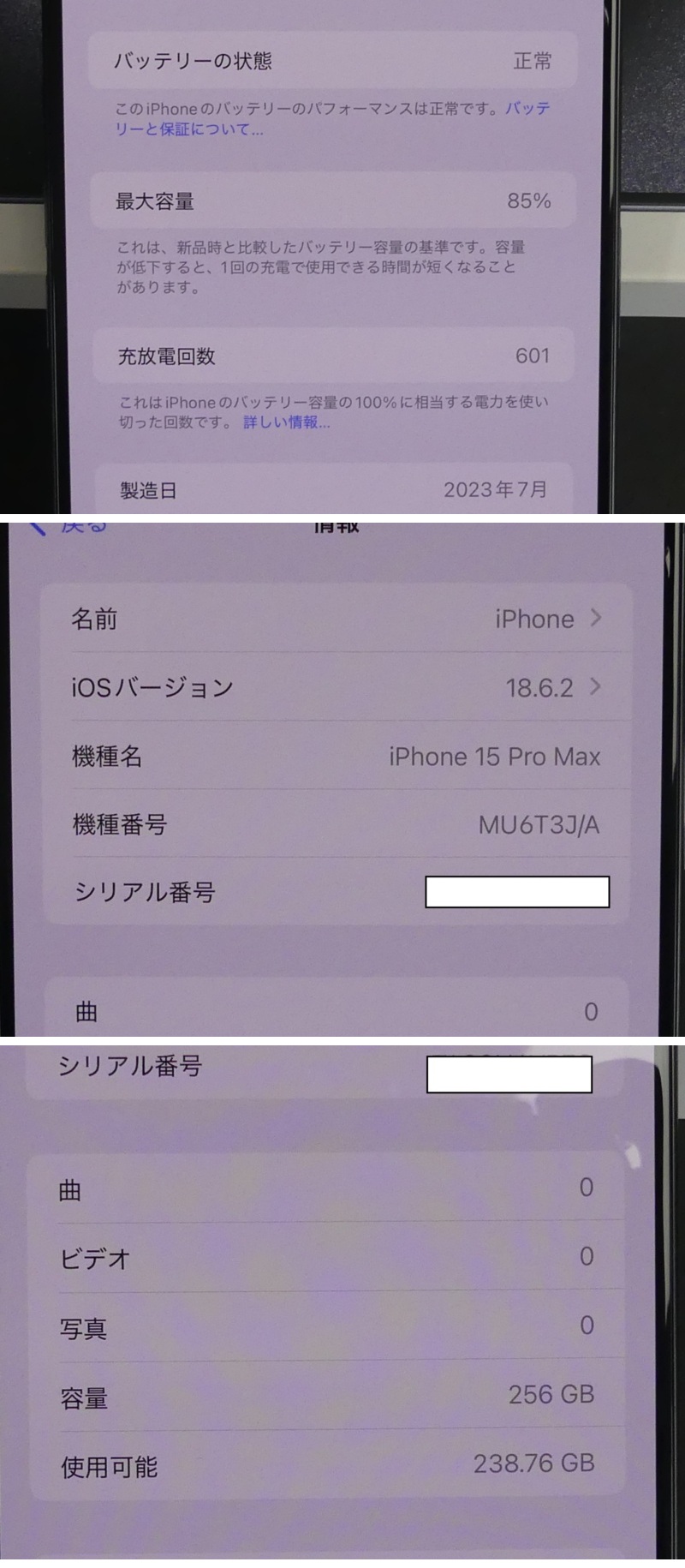 ◇商品情報◇ | 当店の商品をご覧いただきありがとうございます!! iPhone15 Pro Max MU6T3J/A 256GB ブルーチタニウム SIMフリー バッテリー85% アイフォン 【容量】256GB 【カラー】ブルーチタニウム 【型番】MU6T3J/A 【バッテリー最大容量】85% 【アクティベーションロック】解除済み 【シリアル / IMEI】350793221103530 【SIMロック】なし 【キャリア】--- 【利用制限】--- 【Face ID】OK 【バージョン:18.6.2】 【水没シール】反応なし 充電、電源を入れてWiFi接続にてネットサーフィン、アウト・インカメラの動画/静止画撮影、動画視聴、ボリューム操作行えました。 本体はログアウト、初期化済みです タッチも特に反応が悪いといった箇所は無かったです 中古機ですので多少の細かなスレや薄汚れ、小キズなどはございます。 角に小傷などあります 画面下と上にやや線傷あります。タッチ操作はできました 画像よりご確認の上で御検討ください 付属は箱、冊子のみです ※目視チェックをしていますが、表記漏れや見落としや細かな擦れ・薄汚れなどがある場合もございますので予め画像をご確認の上でご入札をお願いいたします。 商品のトップ画像端に写っている茶筅はサイズ比較用の備品ですので付属はしません | ||||||||||||||||||||||||||||||