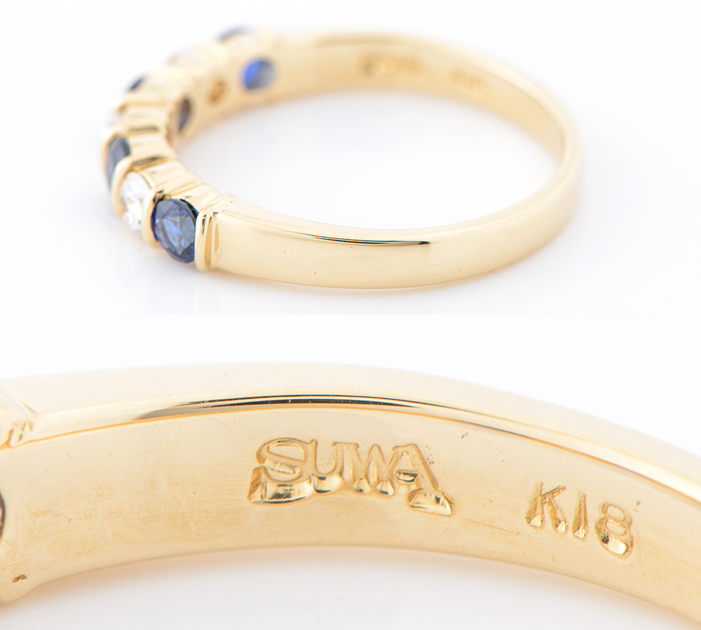 「受け継ぐ人に喜ばれること」というコンセプトで質の高いジュエリーを生み出しているSUWA。ブルーサファイアとダイヤモンドをセットしたエレガントなリングです。眩い煌めきが、華やかな印象を与えます。石と石の間にある18金イエローゴールドのバーが、デザインのポイントに。コントラストの美しい洗練されたジュエリーです。