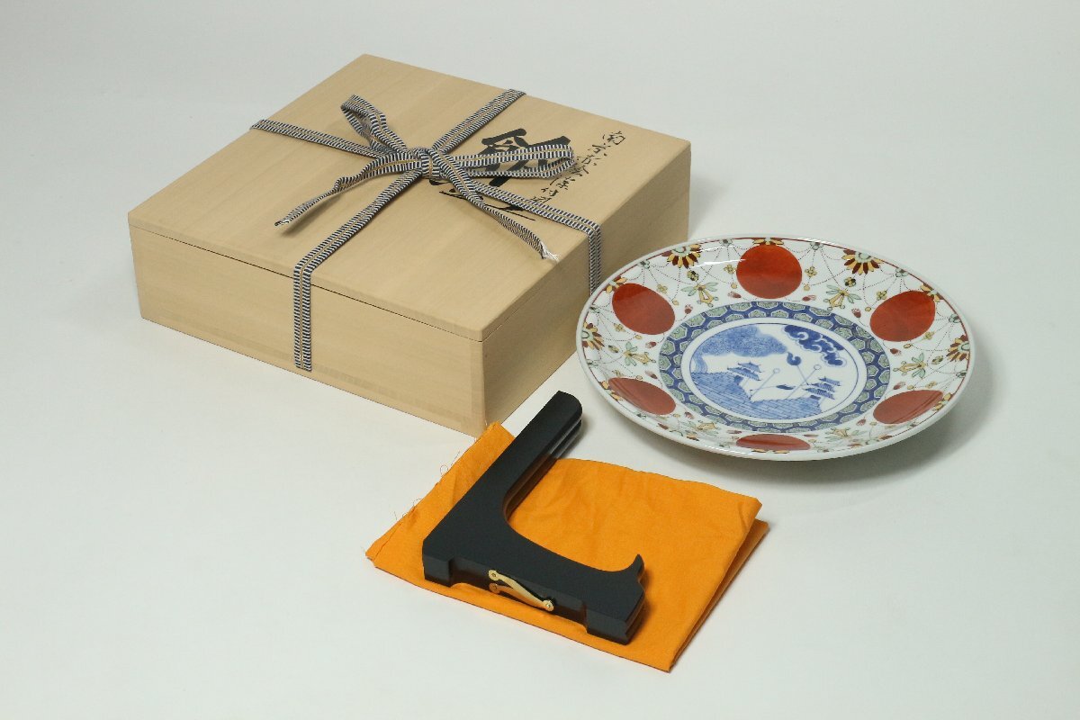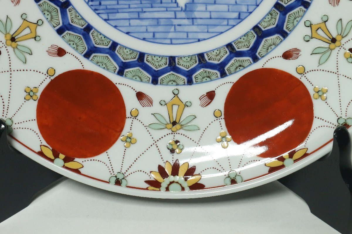 | ・九谷焼 中村重人 南京赤絵染付風 飾皿 共箱 /九谷皿 大皿 飾り皿 |