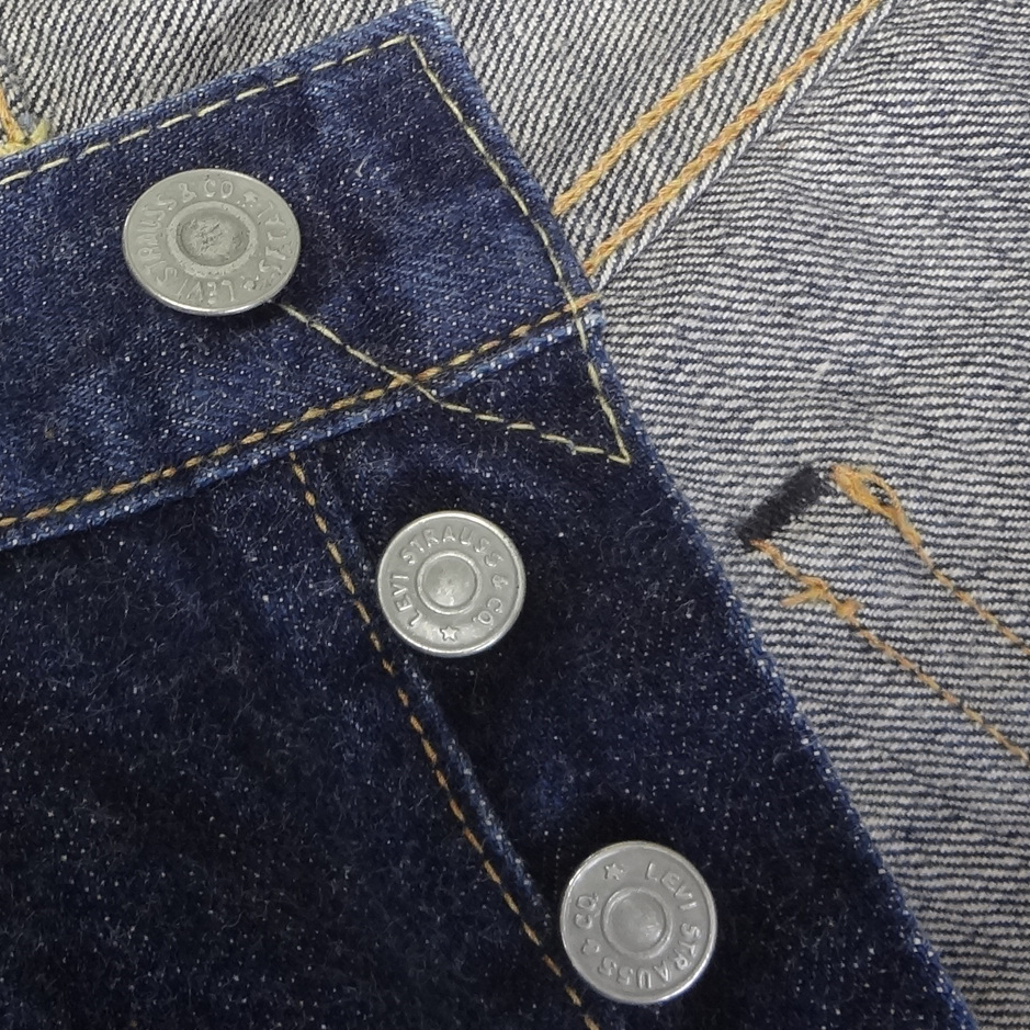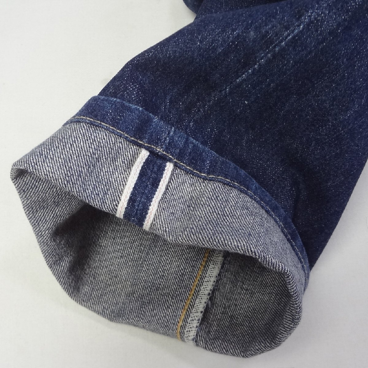 ・ビックEレッドタブ、赤耳デニム、バータック、アーキュエットステッチ、V字ステッチ補強、5ポケットリベット、ペーパーパッチ