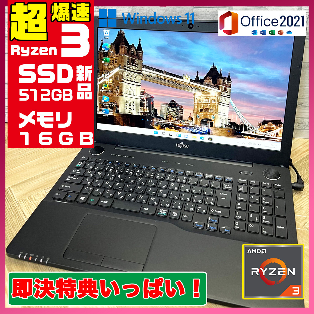 爆速AMD Ryzen 3 2300U(Radeon Vega 6グラフィックス)搭載・驚異のメモリ16G実装 ・超大容量高速SSD512G(新品)のパソコンをリカバリー済みでこの上なく快速にサクサク動作!