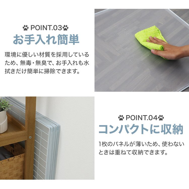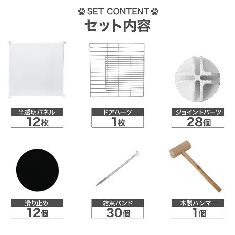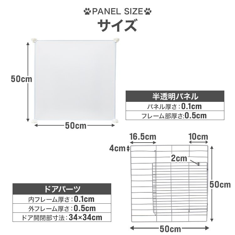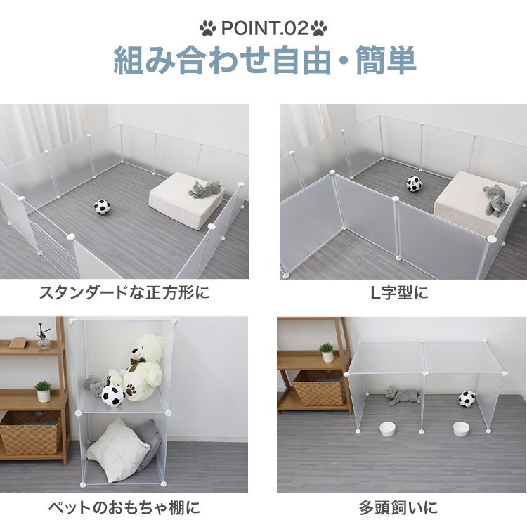 お部屋やシーンに合わせてお好みの形に組み合わせられる パネルペットフェンスです。 正方形、L字型、棚等、お好みの形にレイアウトできます。 ジョイントパーツの横の溝にフェンスを差し込めば、屋根を作ることもできます。 横開き・縦開き、お好みの向きにドアを設置することも可能です。 ペットの出入りや餌の交換などのお世話も手軽にできます! 工具不要!ジョイントパーツをつなげるだけなので簡単組立♪ お手入れ簡単!透明パネルは、汚れても水拭きで簡単にふき取ることができます♪ 圧迫感のない半透明仕様で、ペットも飼い主様も安心です♪ 使わない時は、重ねてコンパクトに収納できます♪ ★こんなシーンで活躍★ ・家電や家具の保護 ・多頭飼育用に ・猫砂の飛び散り防止 ・収納ボックスとして ・飛沫対策・仕切りとして ■商品コード:PC013WH ■商品仕様 サイズ:(約)50×50cm ※その他サイズは詳細画像をご参照ください ■内容 半透明パネル ×12枚 ドアパーツ ×1枚 ジョイントパーツ ×28個 滑り止め ×12個 結束バンド ×30個 木製ハンマー ×1個 ■注意事項 ・ご注文時サイズは必ずご確認ください。 ・サイズ間違い、イメージとの違いによる返品、交換は一切行っておりません。 ・海外製品で簡易梱包での輸入のため風防に擦れや多少の小キズなどがある場合がございますが、 商品自体には問題ありませんのでご了承下さい。 ・仕様・デザインは改良のため予告なく変更することがあります。 ■保障期間 7日間 ※商品到着後7日以内の初期不良・破損のみご対応させていただきます。 【新品未使用品です】 |