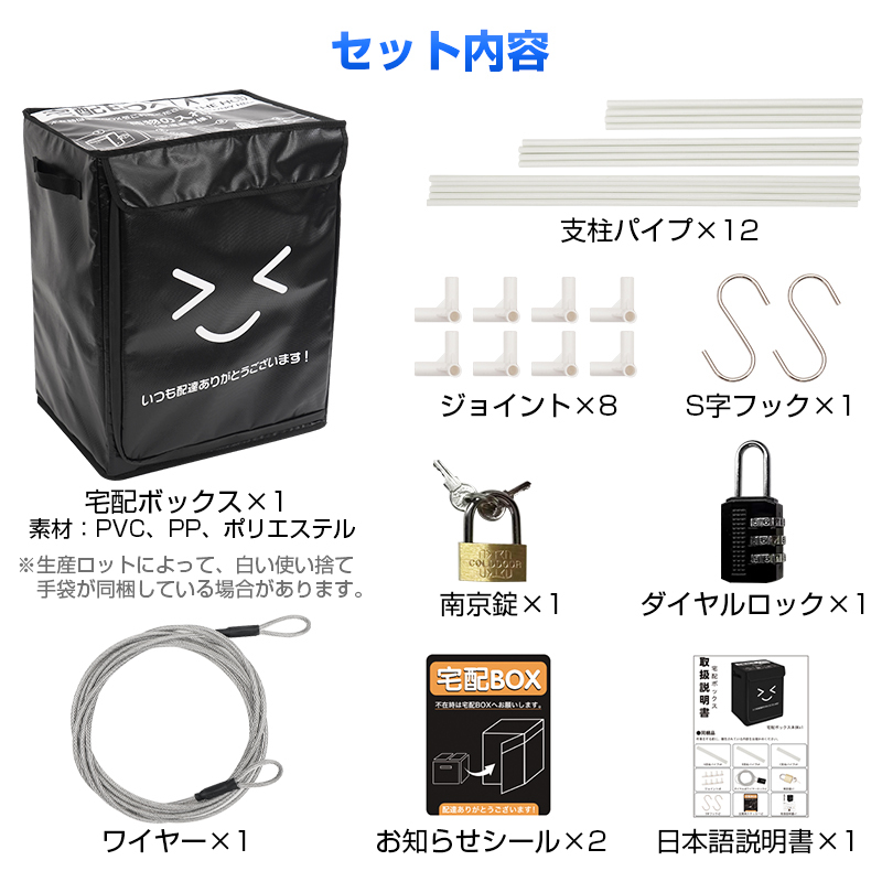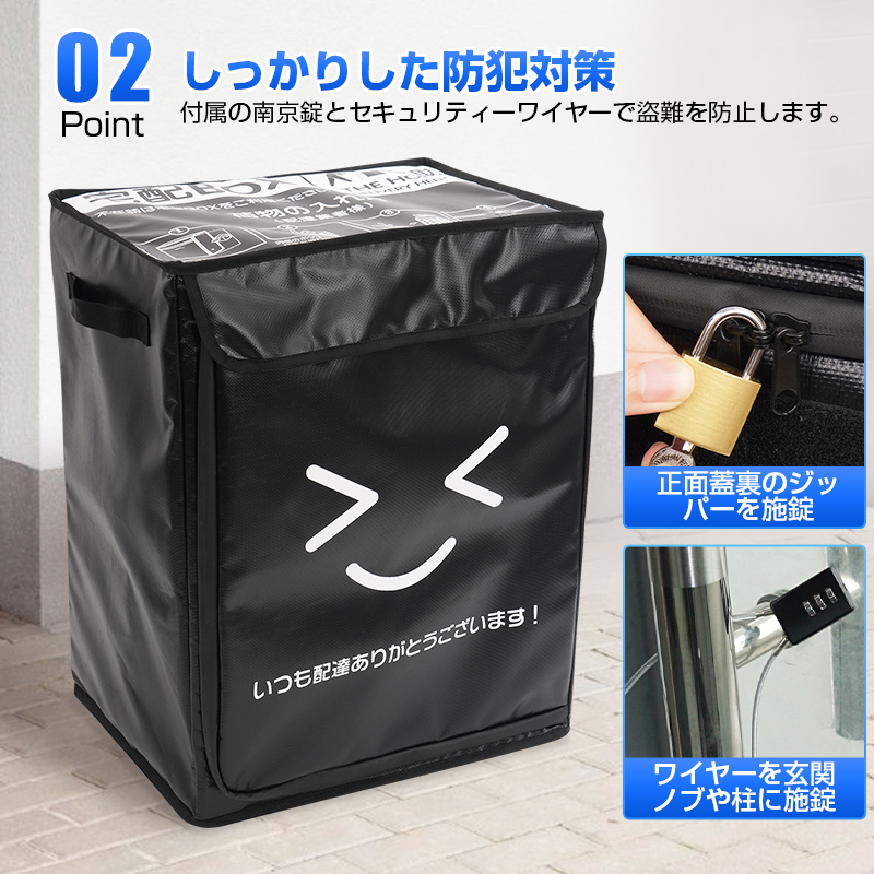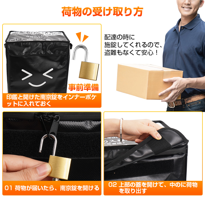 | 商品説明 | 不在でも在宅中でも荷物を簡単に受け取れ、時間を有効に活用できる。 各配送会社の段ボールがすっぽり収まるサイズです。 付属の南京錠とセキュリティーワイヤーで盜難を防止します。 水や汚れに強いPVC素材を使用しています。ジッパー部分も防水仕様で水が入る心配はありません。 印鑑や南京錠などの小物を収納可能です。見えやすいメッシュデザインもポイントです。 場所に合わせてパンと設置可能な3WAYデザイン 優れた素材を採用しているため、断線や劣化も防ぎます! 預け方がプリントされているため、雨の心配も必要なく、配達員も見つけやすいです! 玄関先などに貼って、宅配ボックスがあることを配達員さんへお知らせできます。 ※海外輸入品で輸送時の小傷等ある場合があります。 ※撮影とモニター環境により、実際の商品の色合いと多少異なる場合 もございますので、ご了承ください。 ※リサイクルにダンボールは再利用した物を使う場合があります。 取り付けサポート、説明書がございません。 |