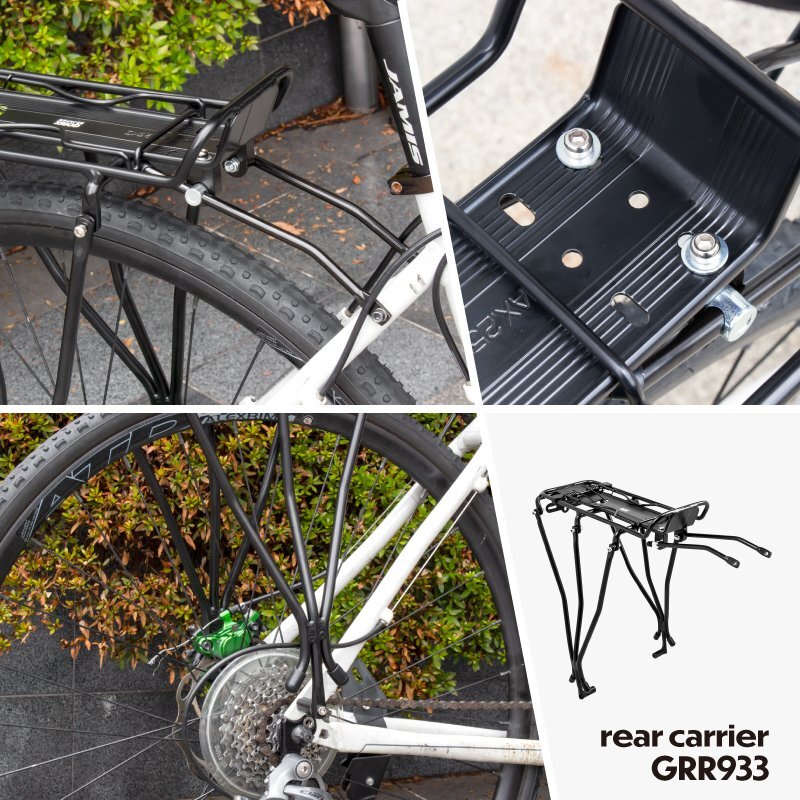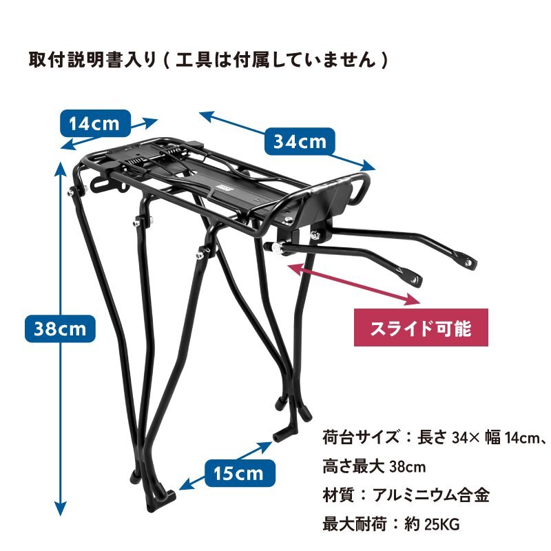 自転車荷台、自転車用リアキャリアを装着して荷物を沢山自転車に積載できる! 自転車通勤・通学やツーリング、旅行、お買物に最適なリアキャリアです。 キャリアを付ける事で背中に汗を掻いて不快な思いをしたり、長時間背負い体に負担を掛ける事も無くなります。 背面には台座があるのでライトなど取り付ける事も可能です。 シートステー上部にダボ穴のない自転車でも装着できるフォークセンターブラケット付属。 リアエンドのダボ穴と2点で固定します。 [耐久性・軽量] 軽量性、強度、耐食性に優れるアルミ素材を採用。また通常の塗装に比べ軽量性、耐久性に優れるアノダイズド(アルマイト)塗装を採用し さらに強化。 [超耐荷重] 最大耐荷重約25kg!重い荷物を積むことが可能。自転車通勤や自転車通学に最適です。 ツーリングで荷物が増えても安心。 [バネ] リアキャリアについているバネは、ちょっとした物を挟んで荷物を固定するときに便利。 [簡単装着] 日本語説明書入りで装着は簡単に行えます。 装着に必要なダボ穴等をご購入前にご確認お願いします。 商品内容リアキャリア、説明書(※工具は付属していません) サイズ長さ34×幅14cm、高さ最大38cm 最大耐荷約25kg 材質アルミニウム合金 ※装着に必要なダボ穴等をご購入前にご確認お願いします。 | |