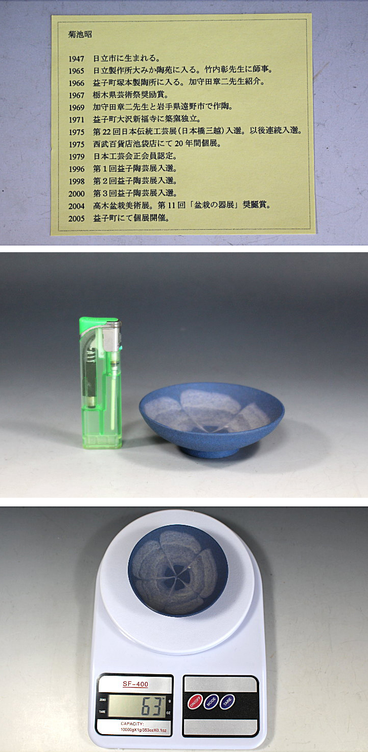サイズ:径8.6cm 高2.6cm 菊池昭の花文酒盃 共箱です。 盃中央に白く見えるのはキズではありません。 僅かに白く盛り上がっているように見えます。 裏側の白く見える点は釉薬が取れているように見えます。 共箱には経年の汚れ・ヤケなどがあります。 盃は菊池昭の作品である事を保証致します。 写真をご覧の上ご入札宜しくお願い致します。 | |