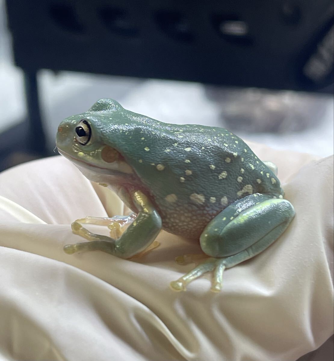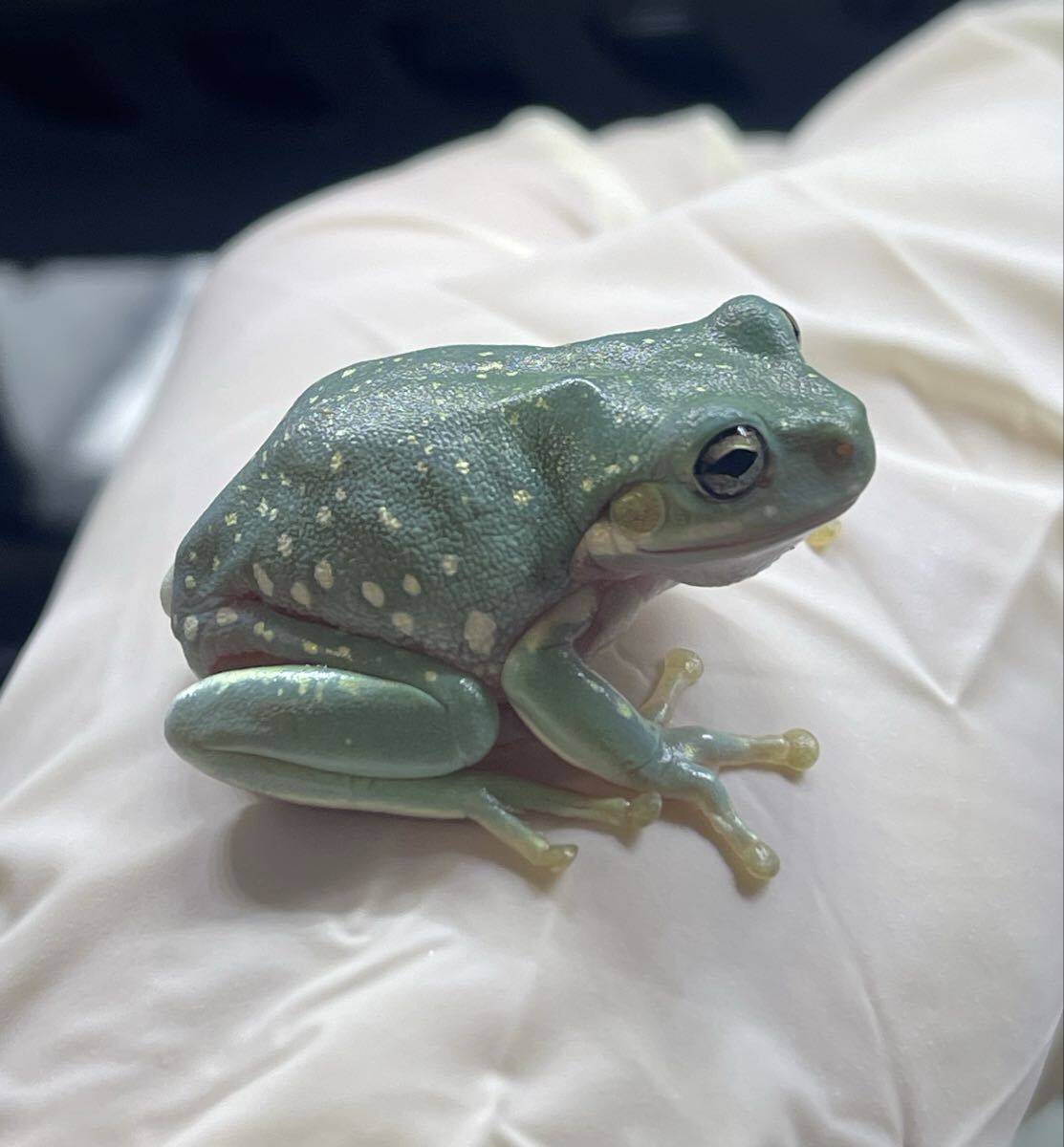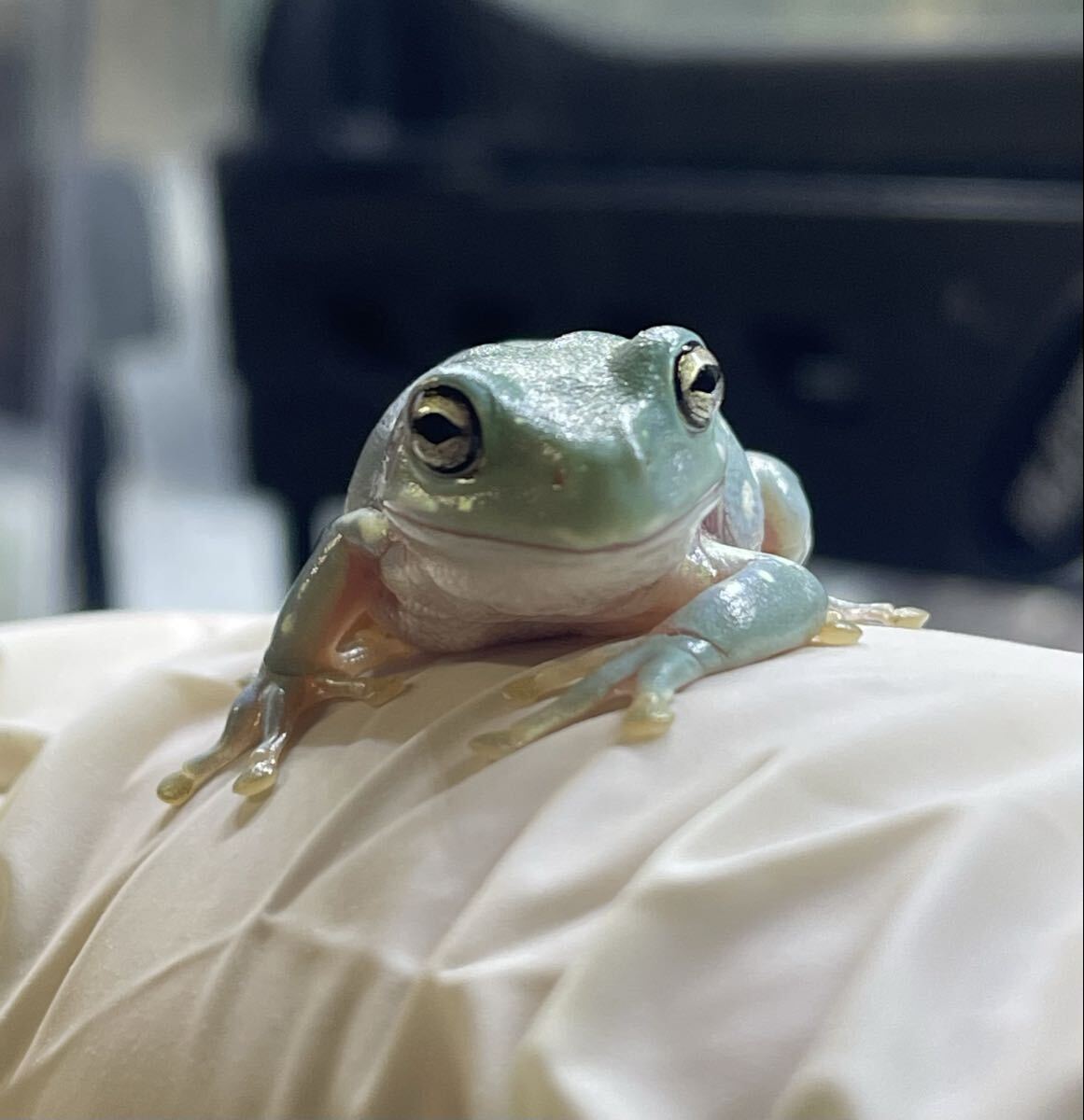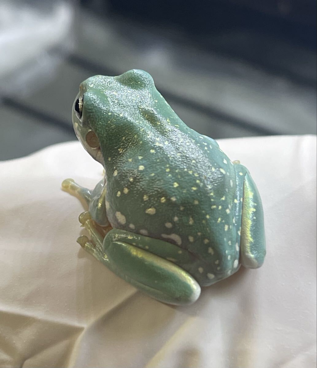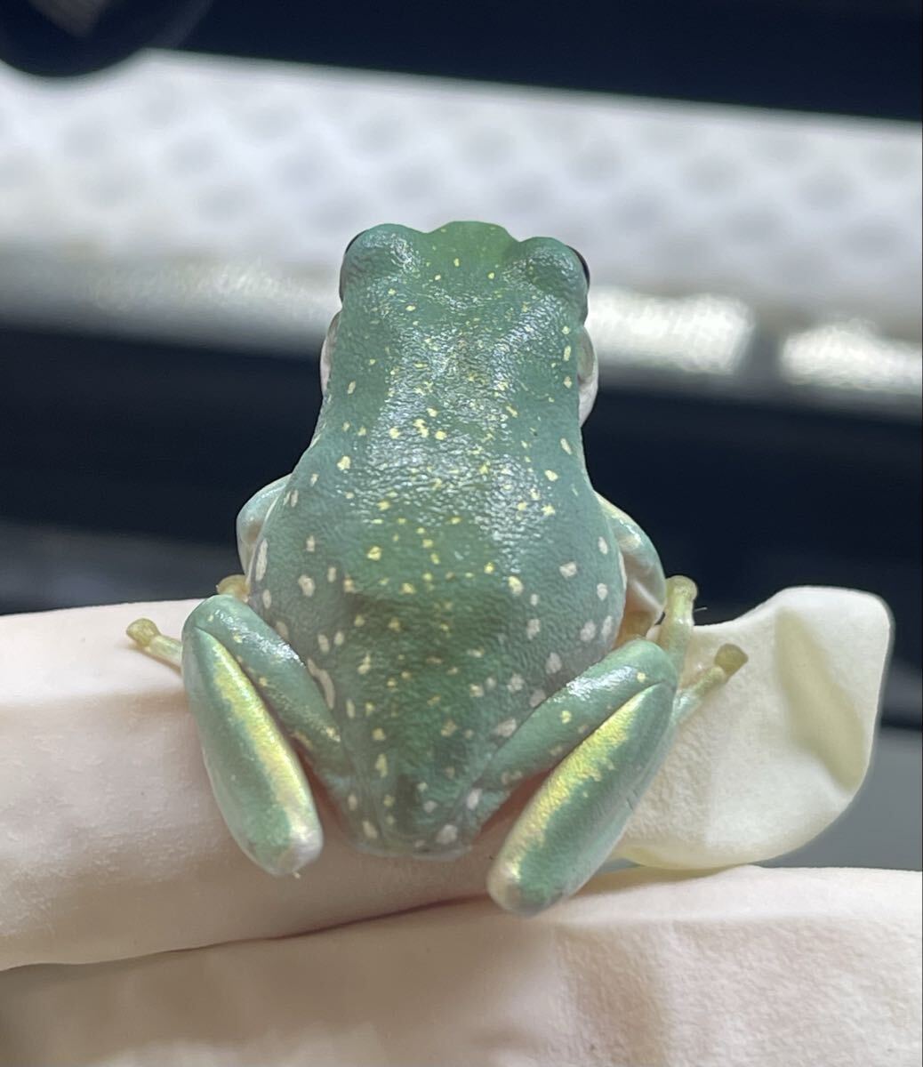 繁殖個体ブルーのイエアメガエルスノーフレークです。成長とともに青色が濃くなる個体です。サイズは3cmです。餌はイエコを与えております。保温して発送しますが生き物ですので死着保証は出来ません。よろしくお願い致します。