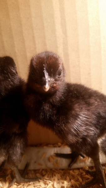 異常遺伝子による黒化ですので、正常な遺伝子に戻ろうとする生命の神秘なのか、先祖返りで羽先が少し茶色い個体(大きくなると消えますが、雄は首周りに再発することが有ります)が出る事が有ります。