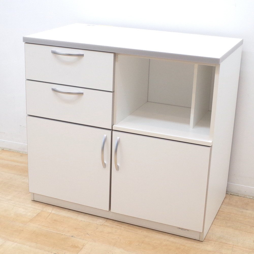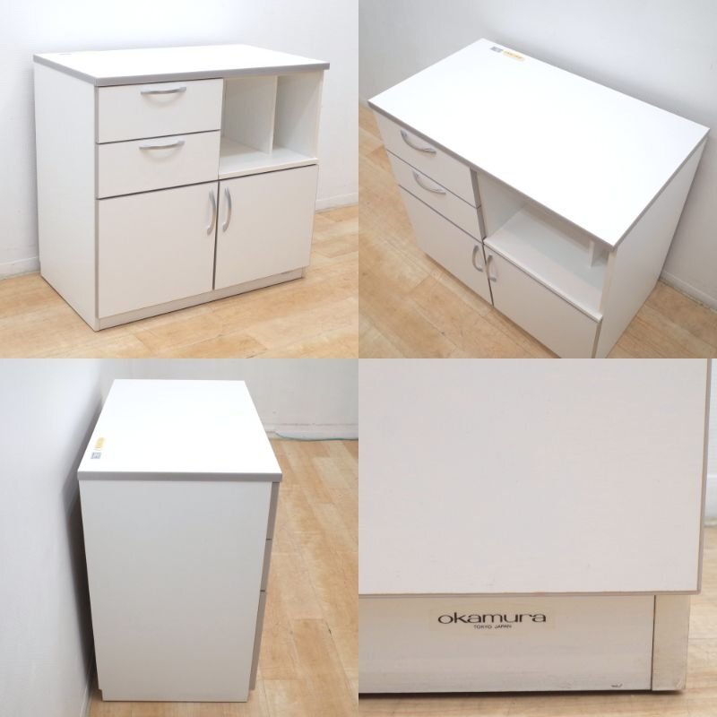 シンプルなデザインと豊富な収納力を兼ね備えた、オカムラのコンパクトなキャビネットです。 上段の引き出し2つにオープン棚、下段の両開き扉収納と、細かく仕分けのできる仕様! 特にキッチン用品の収納に最適! 落ち着いたホワイトカラーは空間に明るさと清潔感をプラスします。 キッチン周りの収納や文具入れなどにして身の回りをスッキリ整えたい方におすすめの一台です。 |