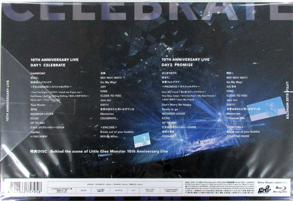 【内容】 メジャーデビュー10周年を記念して2024年10月19日・20日に武蔵野の森総合スポーツプラザにて開催されたLittle Glee Monster 10th Anniversary Live2日間の模様を完全映像化! 【Little Glee Monster 10th Anniversary Live “CELEBRATE”】 【収録内容】 1) HARMONY 2) 好きだ。 3) 放課後ハイファイブ 4)<CELEBRATE>スペシャルメドレー (I Feel The Light / ハピネス/ Catch me if you can / Get down / Rolling Rolling Rolling/ 私らしく生きてみたい / Hurry Up! / I Feel The Light) 5) Your Name 6) SPIN 7) WONDER LOVER 8)ECHO 9)UP TO ME! 10) だから、ひとりじゃない~OVER 11) Jupiter 12) いつかこの涙が 13) 足跡 14) NO! NO!! NO!!! 15) Go My Way! 16) JOY 17) SING 18) CLOSE TO YOU 19) Join Us! 20) SAY!!! 21) 世界はあなたに笑いかけている 22) Memories <アンコール> EN1. Break out of your bubble EN2. Million Miles 【Little Glee Monster 10th Anniversary Live “PROMISE”】 【収録内容】 1) はじまりのうた 2) 好きだ。 3) 青春フォトグラフ 4)<CELEBRATE>スペシャルメドレー (I Feel The Light / ハピネス/ Catch me if you can / Get down / Rolling Rolling Rolling/ 私らしく生きてみたい / Hurry Up! / I Feel The Light) 5) Don't Worry Be Happy 6) Ready to go 7) WONDER LOVER 8)ECHO 9)UP TO ME! 10) だから、ひとりじゃない~OVER 11) 透明な世界 12) ORIGAMI 13) 明日へ 14) NO! NO!! NO!!! 15) Go My Way! 16) 心に空を 17) SING 18) CLOSE TO YOU 19) Join Us! 20) SAY!!! 21) 世界はあなたに笑いかけている 22) Memories <アンコール> EN1. Break out of your bubble EN2. STARTING OVER 【特典内容】 【封入特典/仕様】・3BD(特典Disc(Behind the scene)含)・ライブフォトブック付・豪華Special Package仕様 | |||||||||||||||||||||||||||||||||||