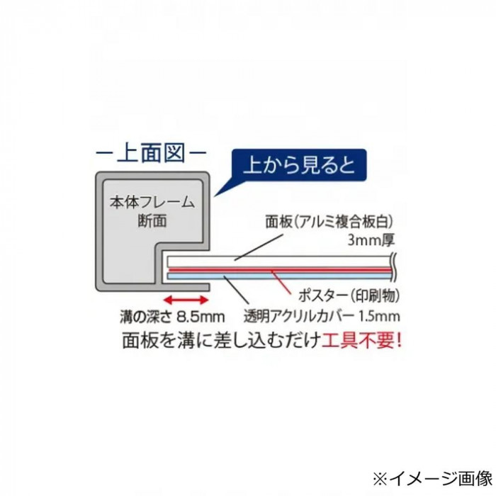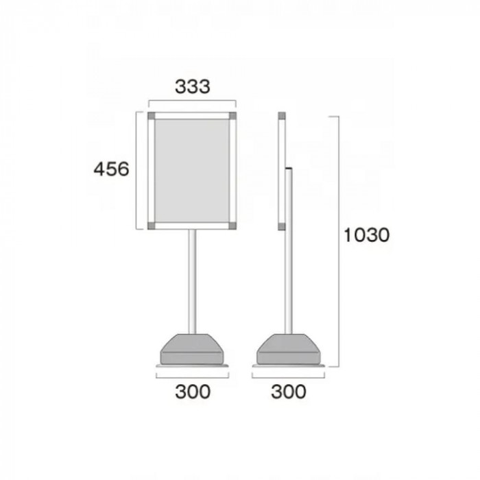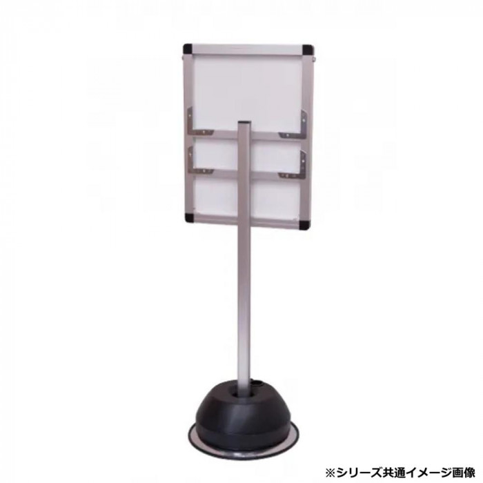 | 素材・材質 | ベース:φ300(スチール製、表面コートステンレス) パネル・ポール:アルミ押出し材(アルマイト仕上(ブラック)) 面板:アルミ複合板(白)3mm厚 表面カバー:アクリル(透明)1.5mm厚 |