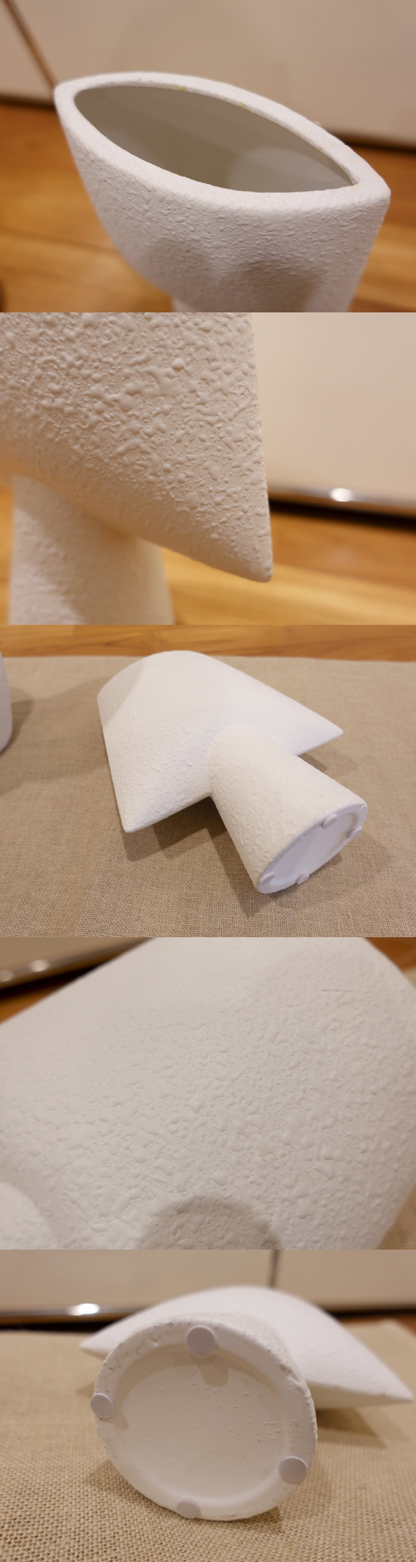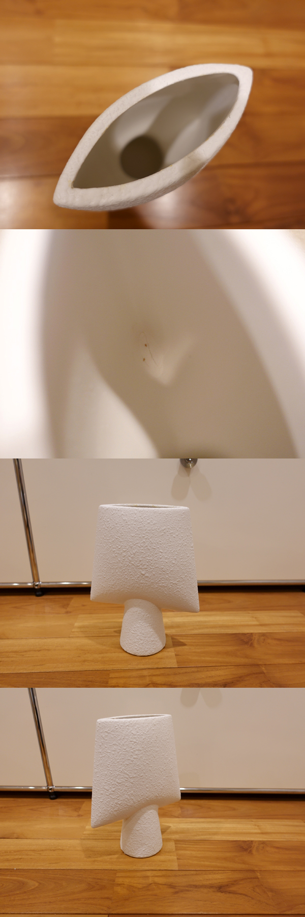ご覧いただきましてありがとうございます。 高級マンションのモデルルームでディスプレイに使われていた、セラミックの花器です。 おそらく、デンマークの「101 COPENHAGEN ワンオーワンコペンハーゲン」の製品と思われますが、ブランドラベルやシールの類いはついておらず、断定ができません。デザイン、仕上げ、サイズなどから、ほぼ間違いはないものと思いますが、メーカー不明といたします。 こちらのウェブサイトもご確認ください。 https://greeniche.jp/collections/101-copenhagen-sphere-vase-square-bubble-white https://101cph.com/collections/vases/products/sphere-vase-square-mini-bone-white 防水仕様ではないため、水を入れてのご利用はできません。ご注意ください。 コンディションですが、高級マンションのモデルルームで展示利用をされていたもので、とくに目立つ大きなキズもなく、全体的に良好です。 内側に、画像のような小さな亀裂のようなものがございますが、おそらく製造時からあるものと思われます。 こちらの出品のほか、モデルルーム展示品のクッションや小物類を多数出品しております。 →こちらから一覧表示ができますので、あわせてご覧ください。 |